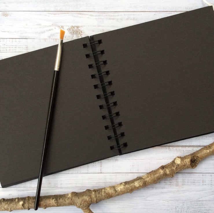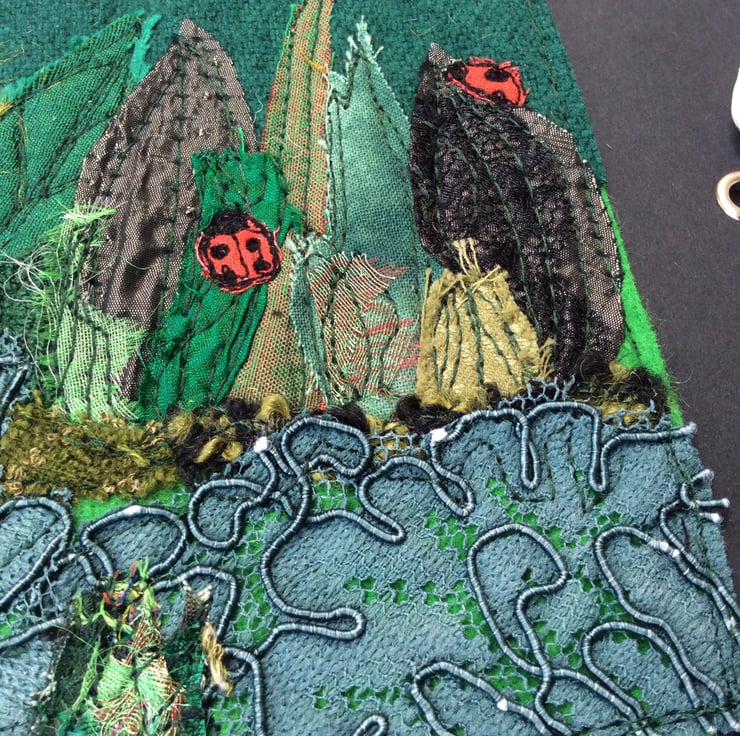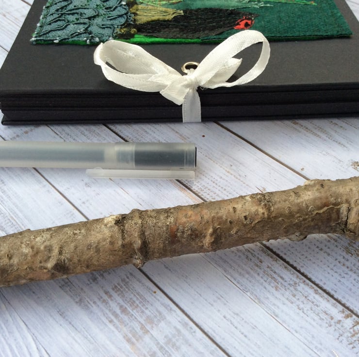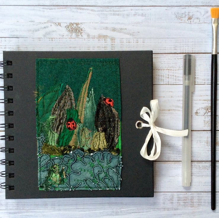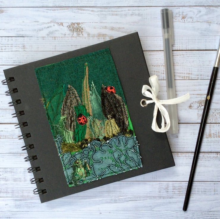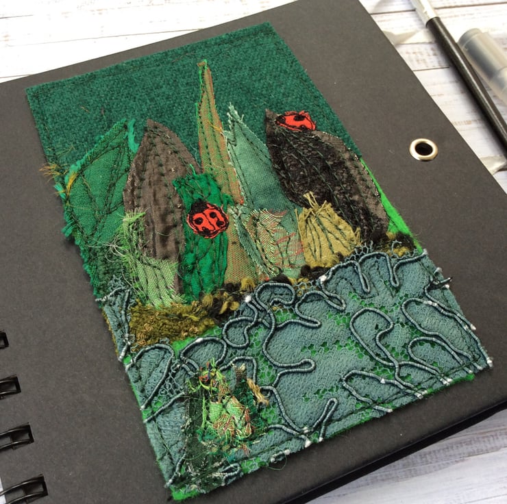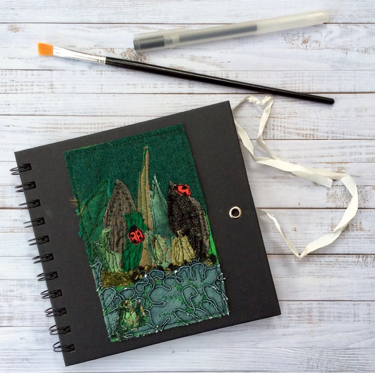 This square sketchbook has been enhanced with hedgerow plants, grass and undergrowth with two little ladybirds, all made from up-cycled fabrics and enhanced with free motion embroidery. It’s ideal for journaling, painting, scrap booking or for any art project. The spiral bound square sketchbook is made with 200gsm thick black paper and a hardback cover, measures 15 x 15cm, 1.5cm deep and contains 40 pages (80 sides). The cover is held closed by a white ribbon to keep contents safe and tidy. The artwork measures 10 x 7cm.