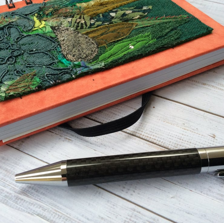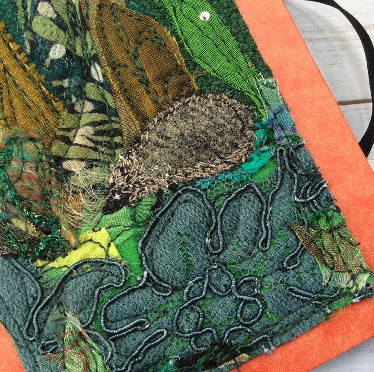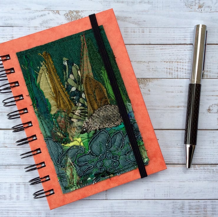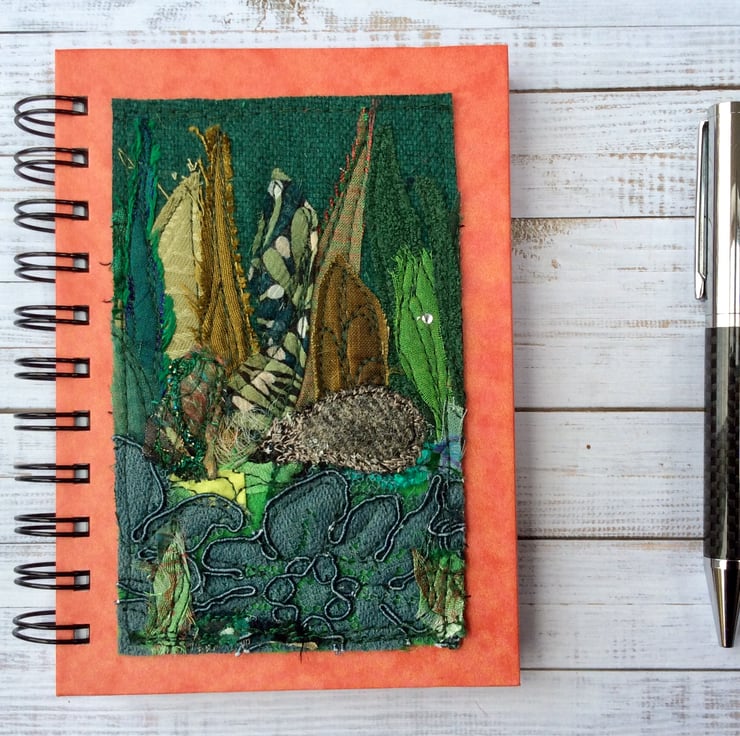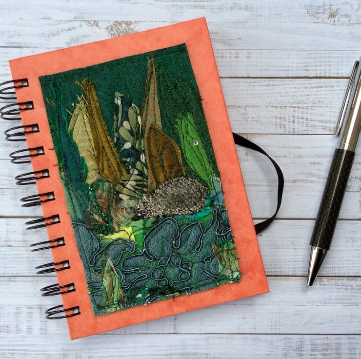 This sturdy A6 hardback spiral bound notebook has been enhanced with an embroidered garden plants with a hedgehog. Its made from up-cycled and recycled fabrics with free motion embroidery. It’s ideal for making notes, lists or doodling, and will neatly fit a handbag or pocket. It measures 155 x 120mm, contains 192 pages at 80gsm which are feint lined, and it has elastic to keep it compact. The artwork measures 8.5 x 13cm.