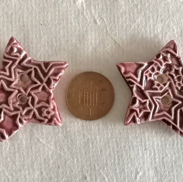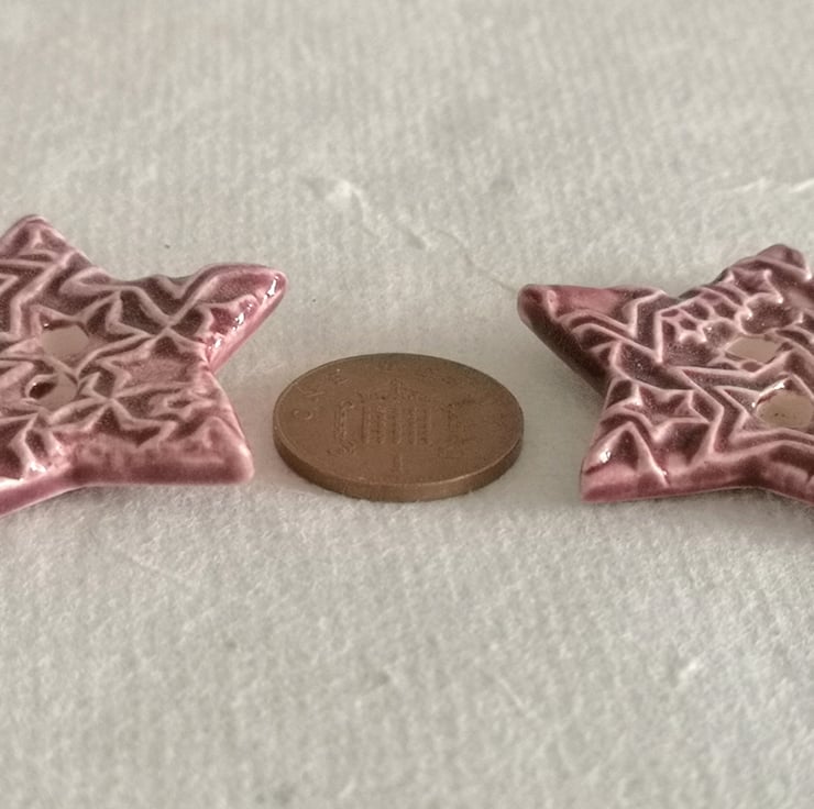 These two ceramic star shaped buttons are handmade by Cariad Clay. They have a deep burgundy glaze and a raised star decoration. They have a plain burgundy glazed reverse. They are sold separately. Please select 2 as your amount if you would like both of them.