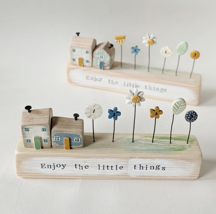 These little hand-painted wooden homes have teeny doors and windows and a garden of button and clay flowers.