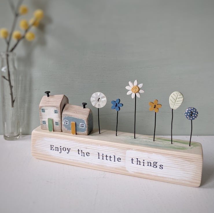 Hand stamped on the front are the words 'Enjoy the little things'.