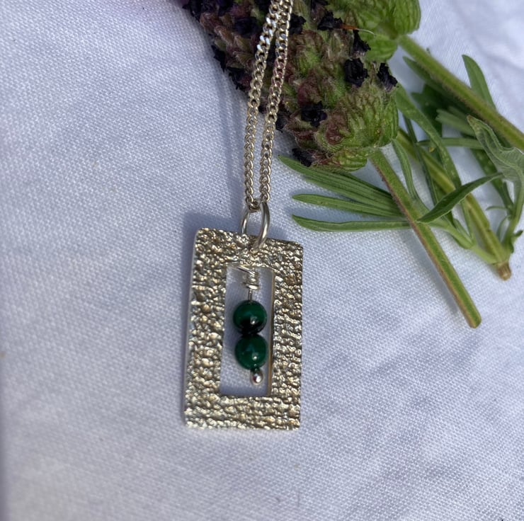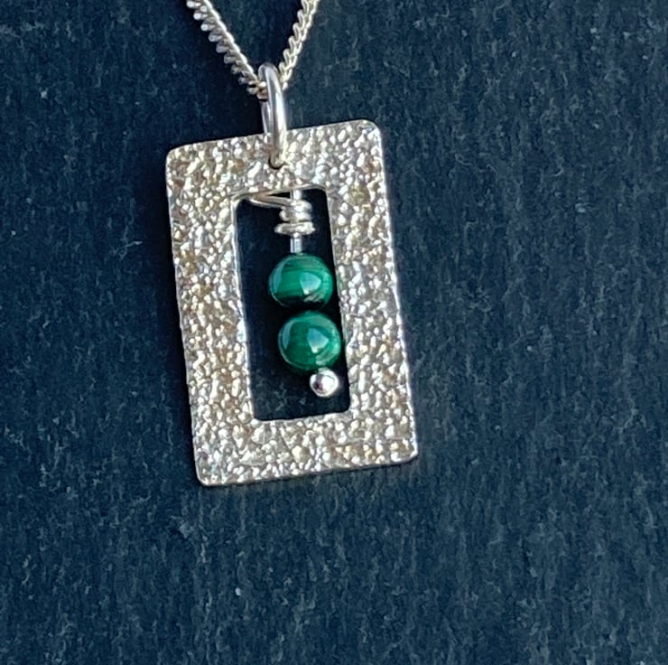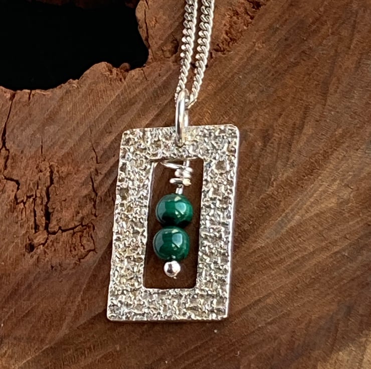 This pendant is made from fine silver to create a textured silver frame with 2 malachite beads hanging in the centre of the frame.