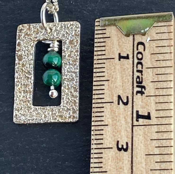 The silver frame length is approx 2.5cm. The 3mm malachite beads hang on sterling silver wire attached to the frame by a sterling silver jump ring onto a sterling silver chain measuring 18” in length.