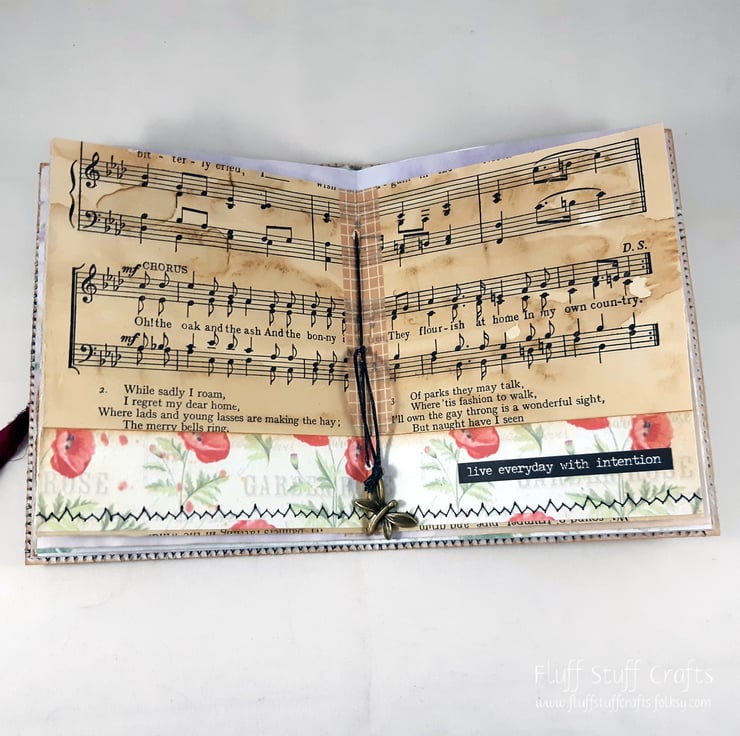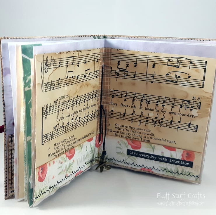 The book has 18 pages (36 sides) of music paper, upcycled diary paper and hand dyed papers, tied in with waxed thread. A small metal charm is attached to the thread. There are pockets in the centre pages, as well as the front and back cover.
