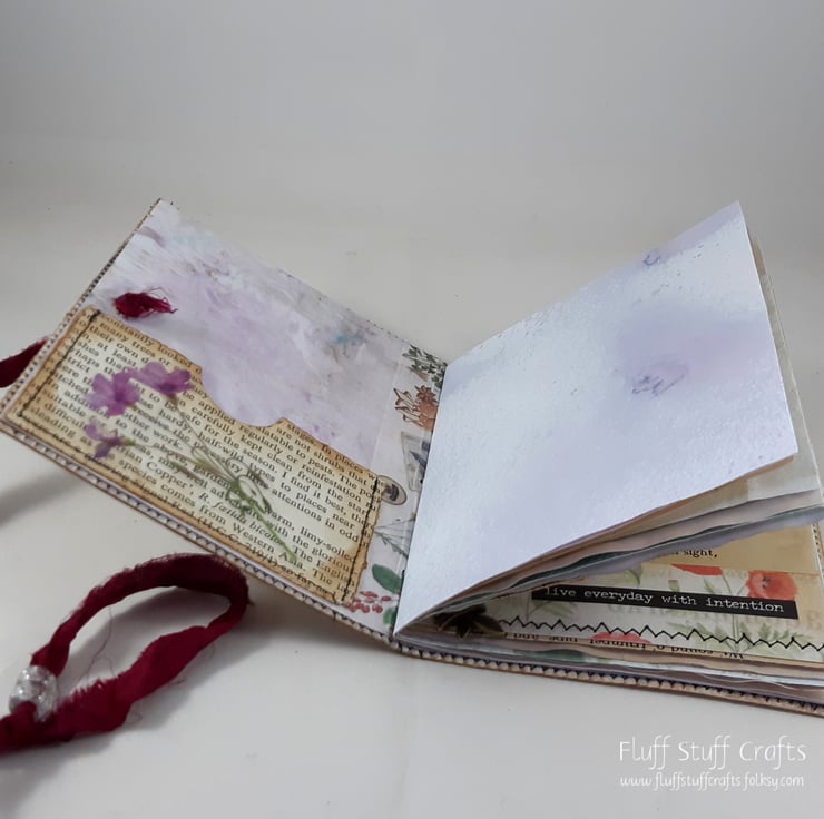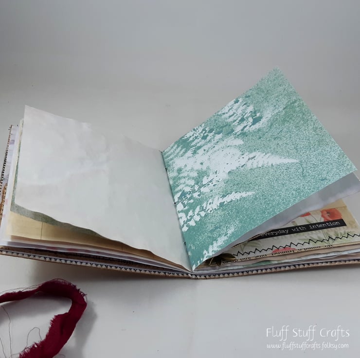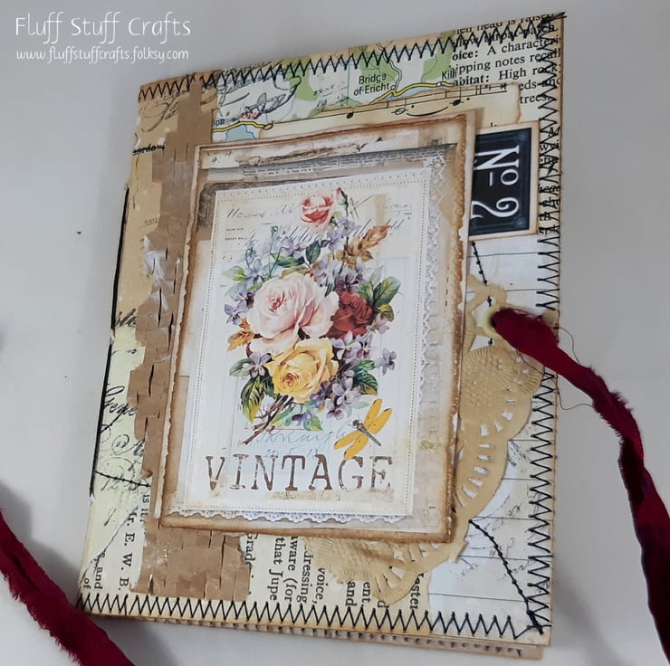 Small notebook/junk journal created with a collaged scrap papers cover and tied with burgundy sari silk ribbon.