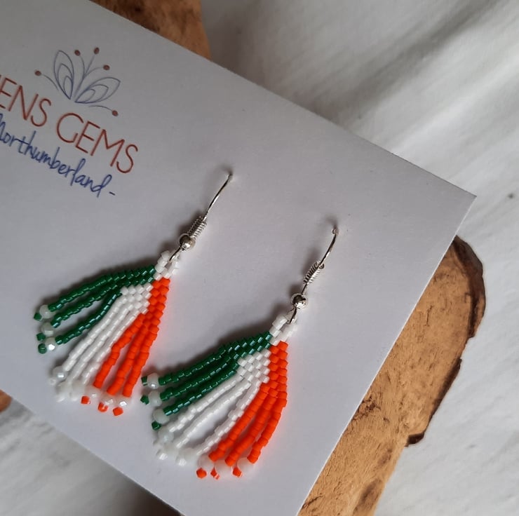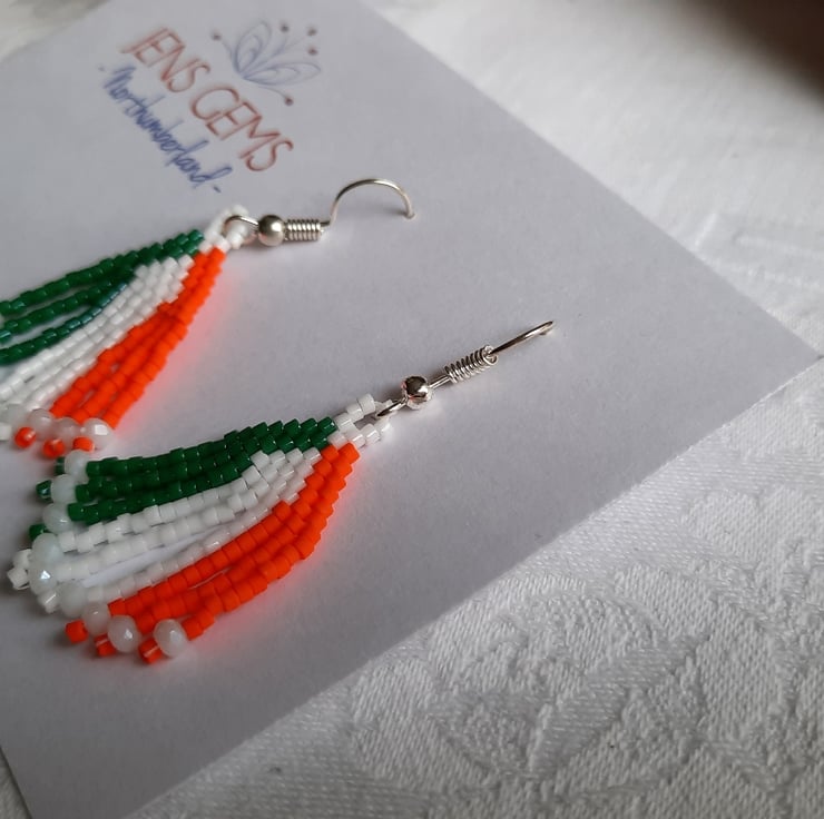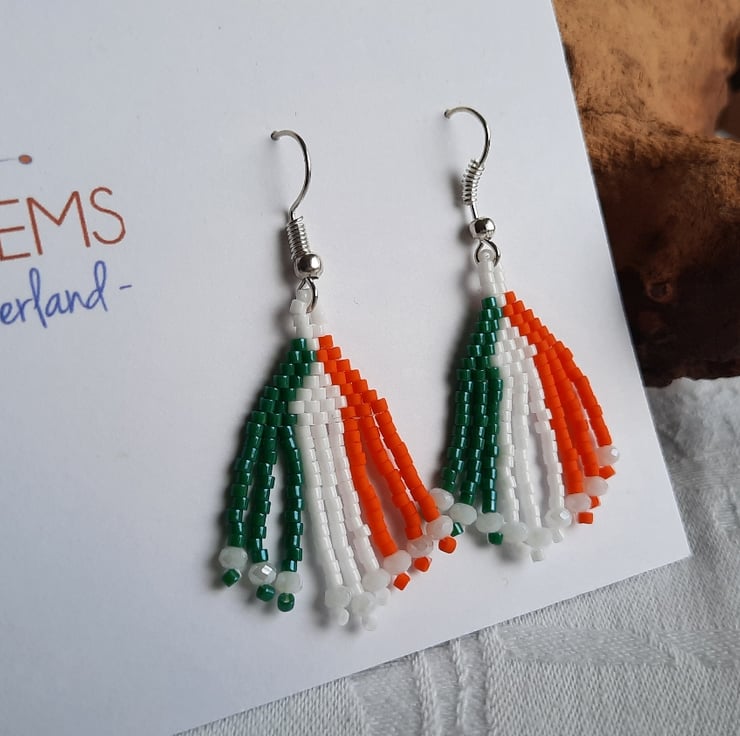 A pair of beadwork tassel style earrings in the colours of the Irish flag. They have a drop of approx. 3.5cm and are approx. 1.5cm wide. They are made using Japanese delica beads and white faceted Chinese crystal rondelles. They have silver plated ear wires but can be change to sterling silver if required. The earrings are also in the colours of the Ivory Coast flag and can be changed so that the orange stripe is on the left hand side.