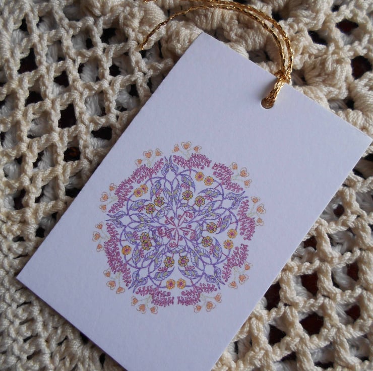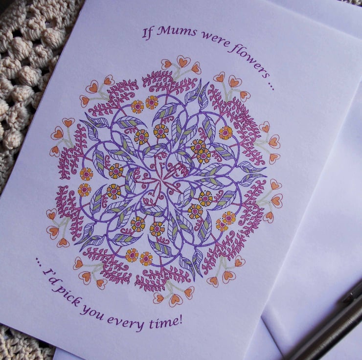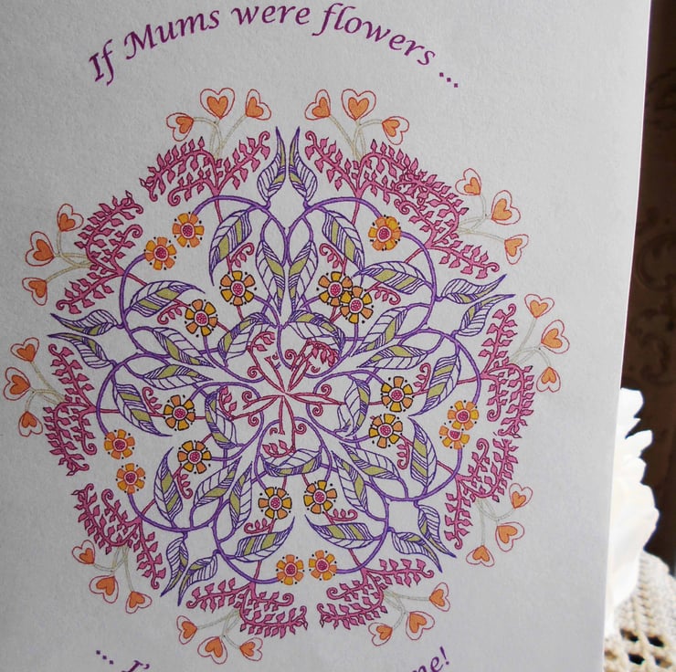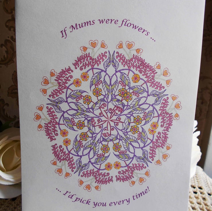 This delightful Mother's Day greetings card design is taken from my original handdrawn artwork in mixed media. It features an ornate mandala filled with beautiful foliage and flowers, and trimmed with a lovely border of little heart flowers.