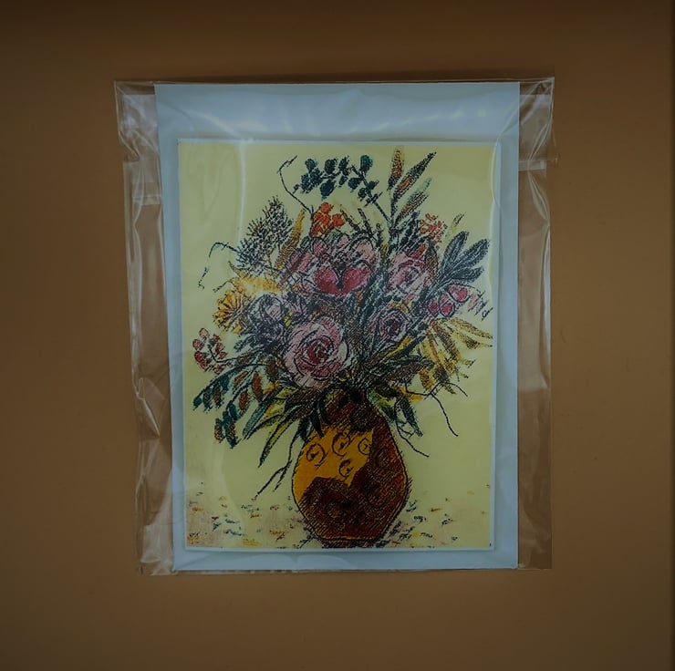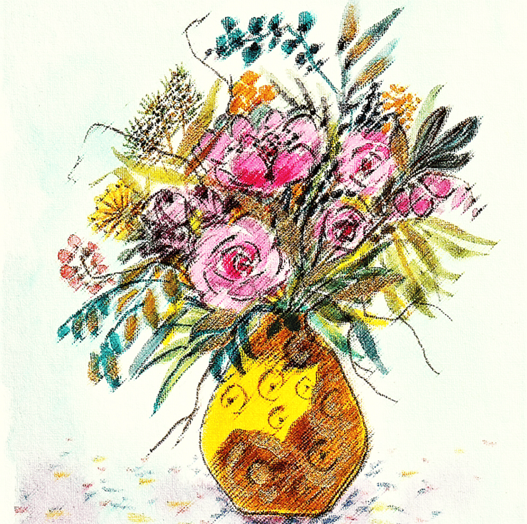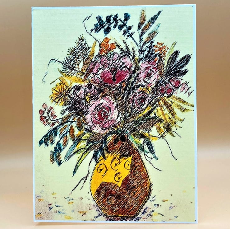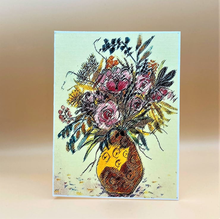 Taken from one of my original watercolour paintings this little Birthday card is a charming way to send Birthday greetings. The card shows a floral arrangement with pink roses surrounded by other mixed flowers and grasses in yellow, orange, green and blue in a boldly patterned vase of yellow and terracotta. The colours are subtly muted and the card image is manipulated which lends air of sophistication to the print.