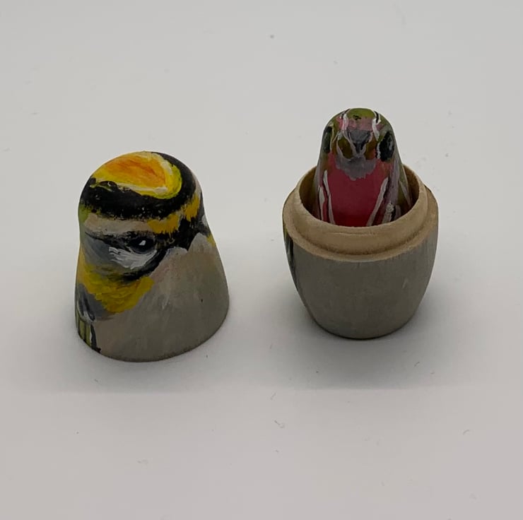 The tiniest of woodland birds, a firecrest sits inside the hedgehog, it measures 4.5cm tall by 2.5cm wide.