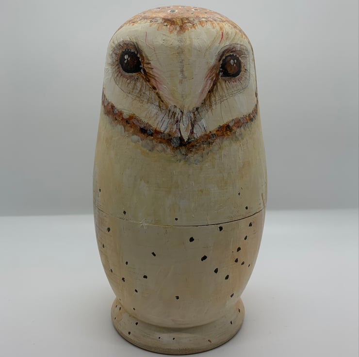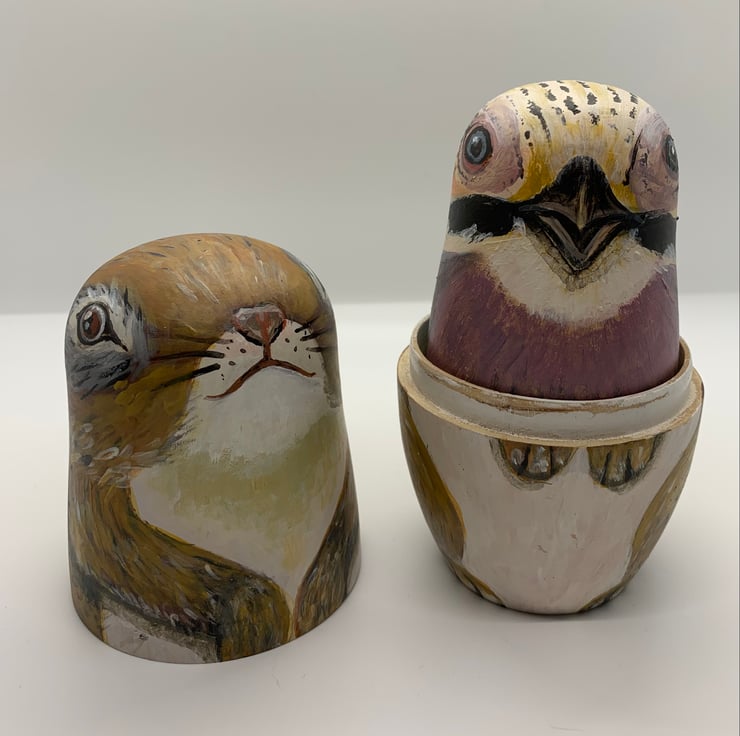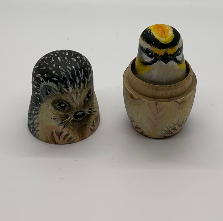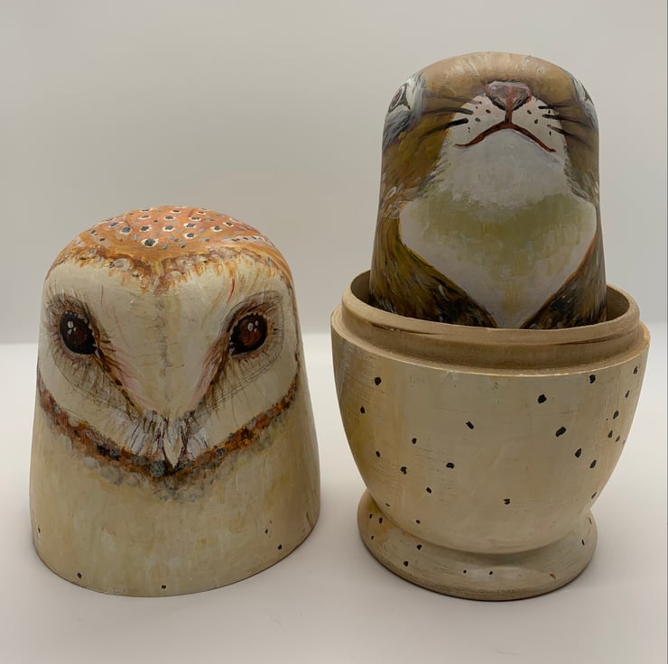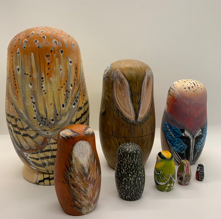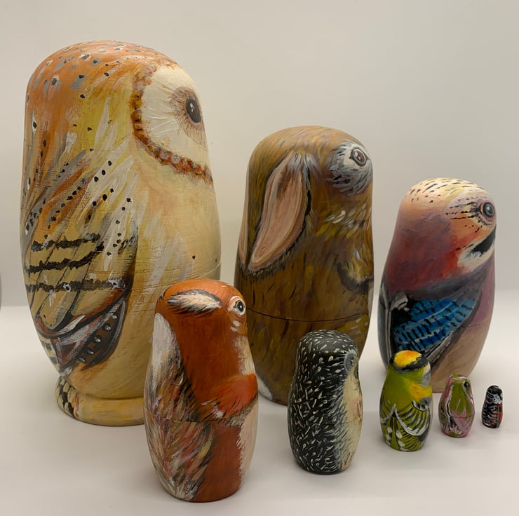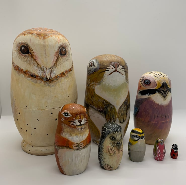 To wit, to woo! An original and unique hand painted set of eight wooden nesting dolls, depicting some of our most loved creatures of the British countryside.