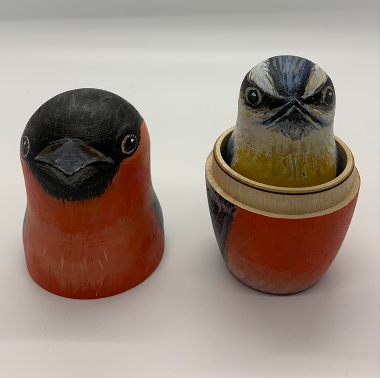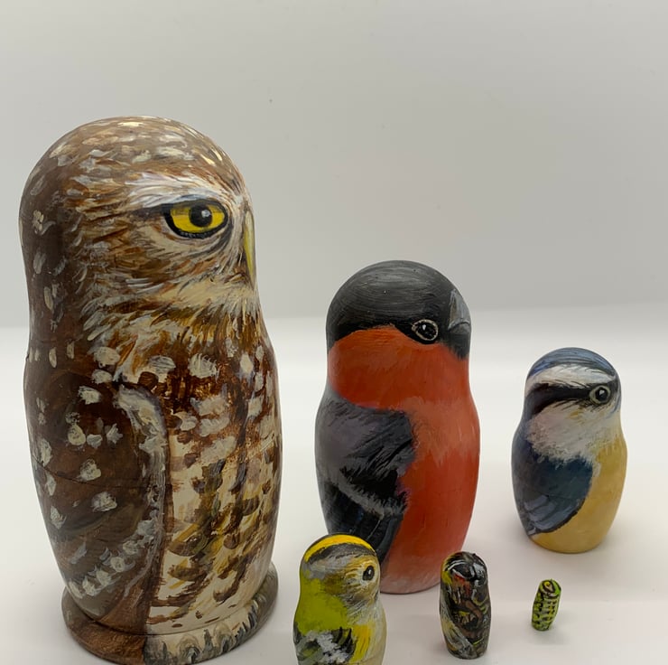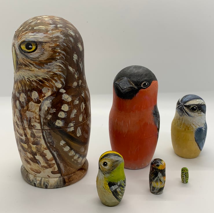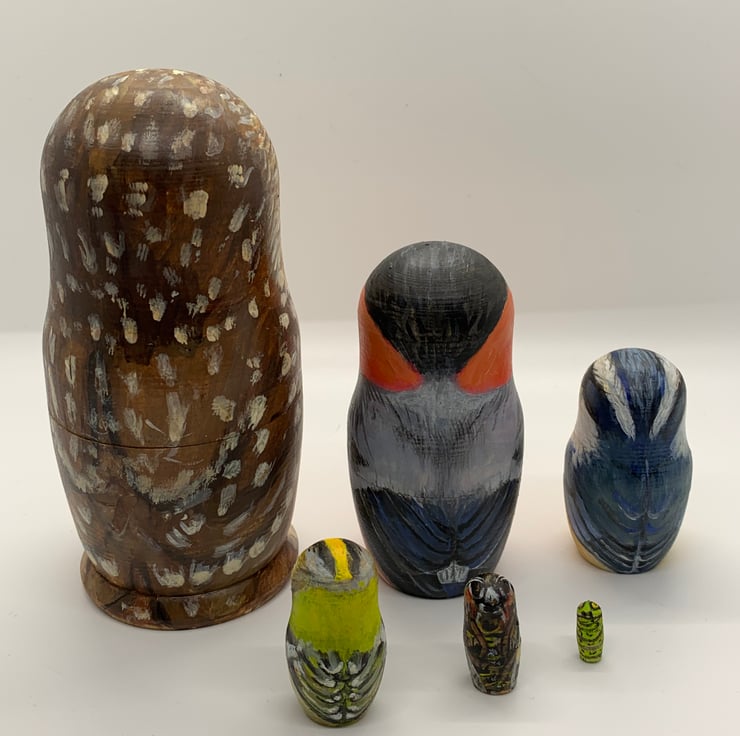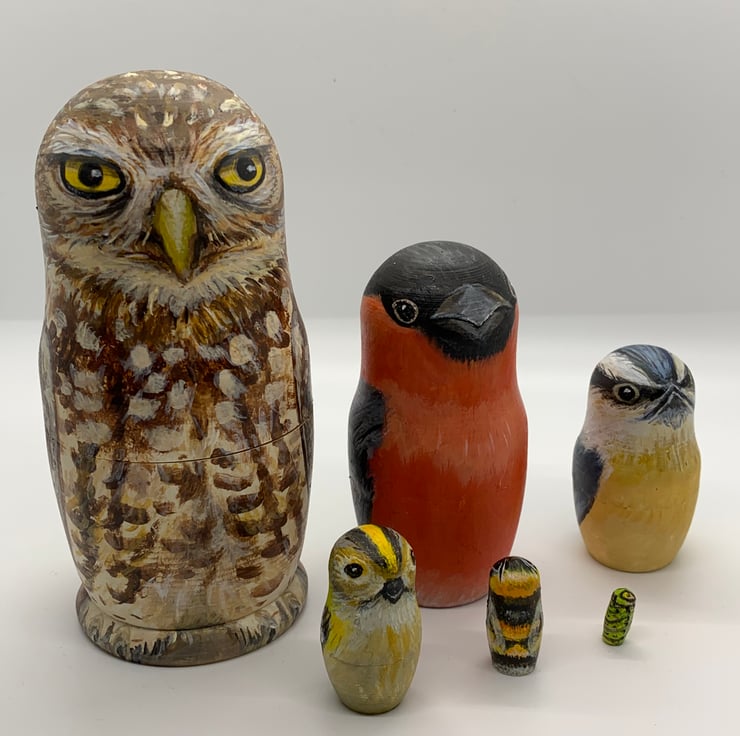 Oh what a glorious thing to bee! An original hand painted 6 piece set of wooden nesting dolls, featuring well-loved British birds and a big, beautiful bee.