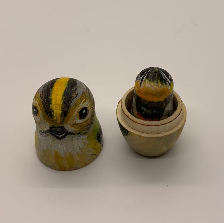 Inside the nuthatch you will find a tiny Goldcrest, one of our smallest British birds. This dinky goldcrest measures 4cm tall by 2cm wide which is close to life sized!