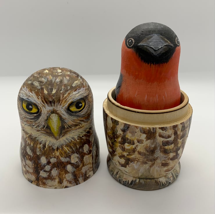 Inside the owl is a male bullfinch with his very stylish rose and grey colouration. He measures 9cm tall by 4.5cm wide.