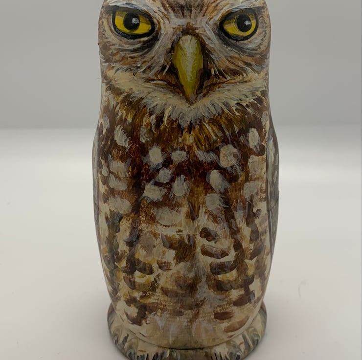 This small and quirky design features a Little Owl with distinctive yellow eyes, peering out from under bushy, feathery brows. The little owl measures 13cm tall by 6.5cm wide.