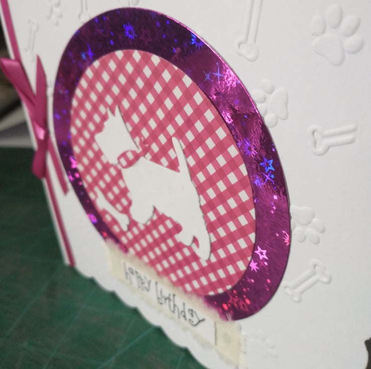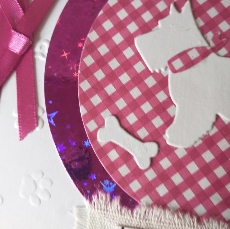 A completely handmade and uniquely designed card. Consisting of a westie and bone mounted onto check card, pink holographic card, then onto dog inspired embossed quality pristine white quality card. Happy birthday handwritten in black ink on linen