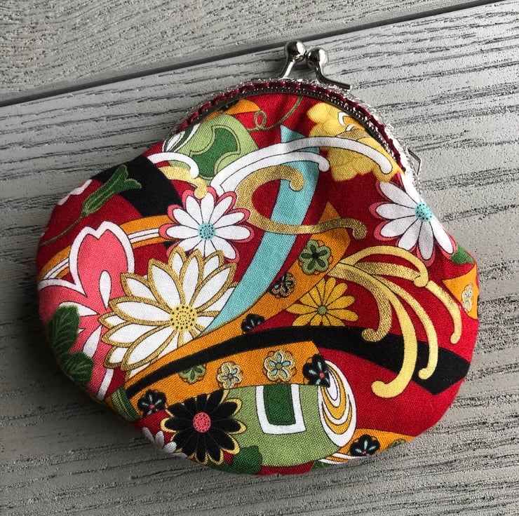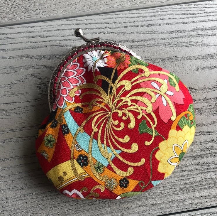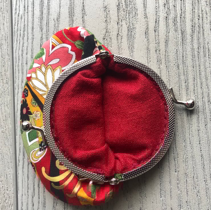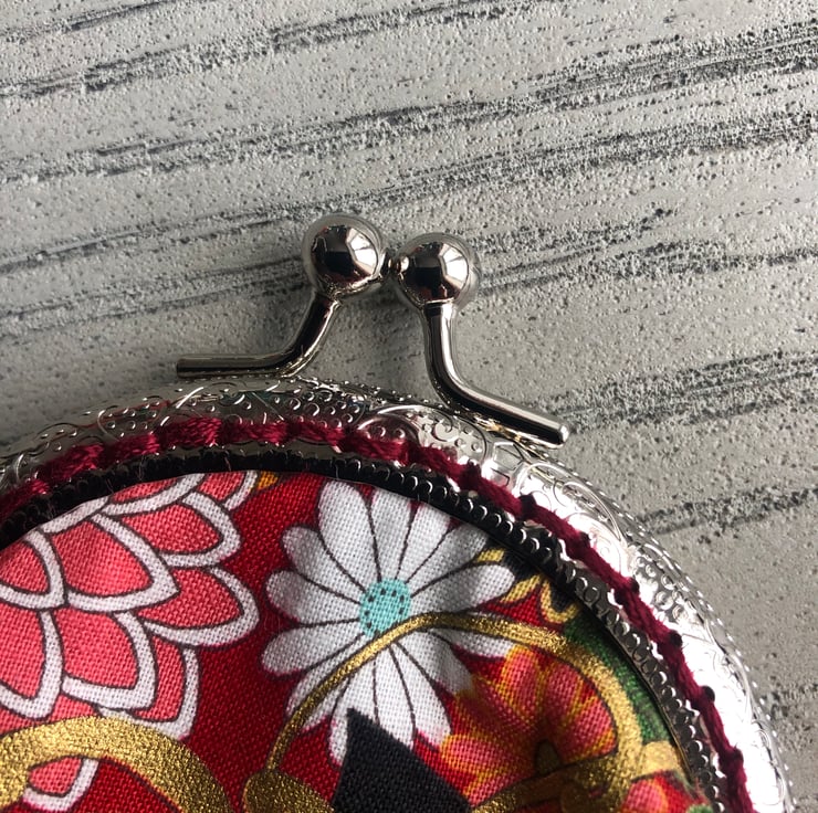 This three and a quarter inch silver coloured metal frame is hand sewn to the purse with a rich red six strand embroidery thread. Embossed with a swirl and dot pattern, it has a satisfying snap to close.