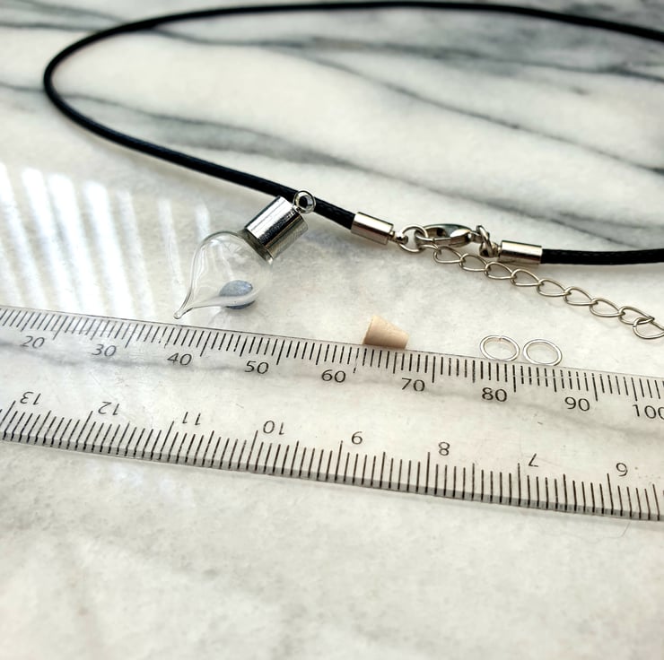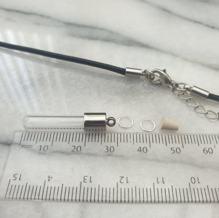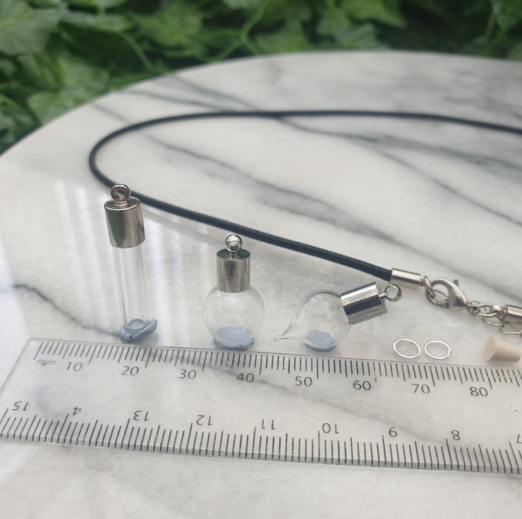 This small kit includes a tube-shaped, rounded-base or pointed base vial and findings to make a glass vial pendant. These vials are perfect for ash, locks of hair, glitter, flowers, rice and beads- whatever you can fit into them!