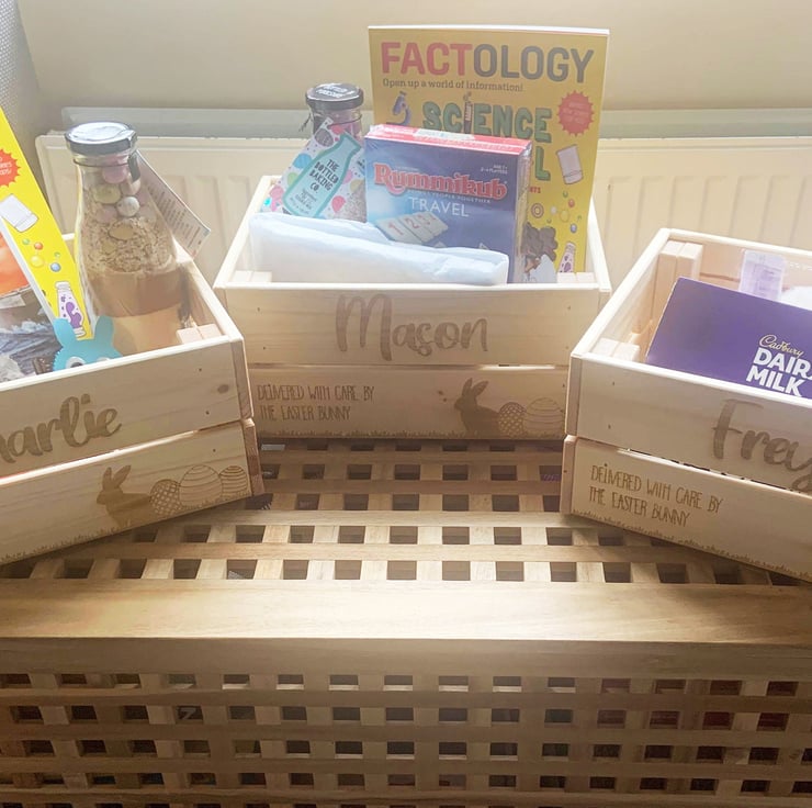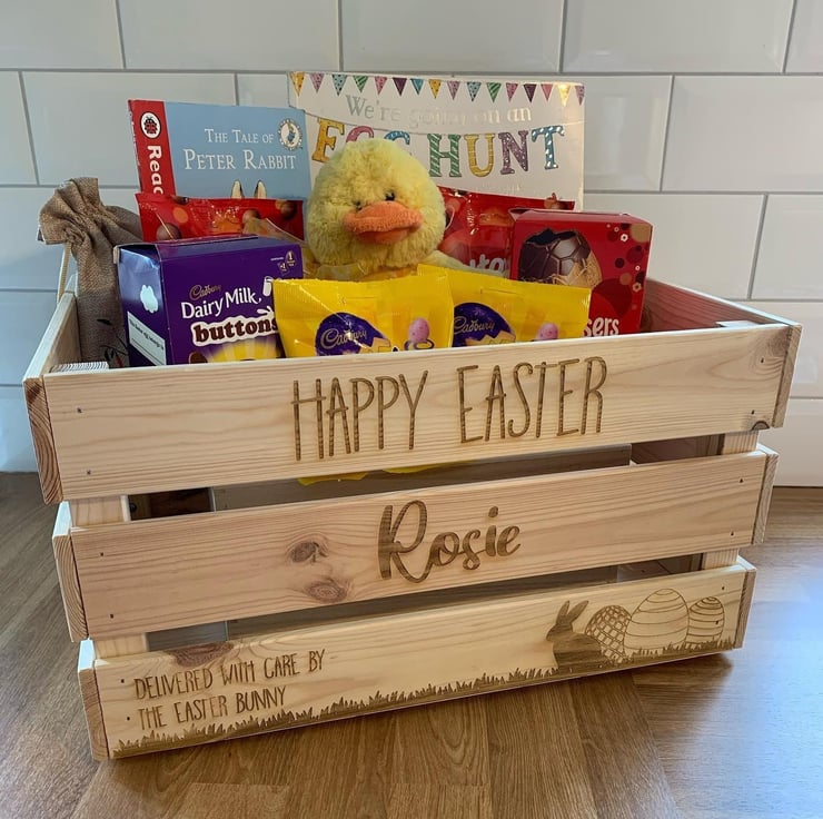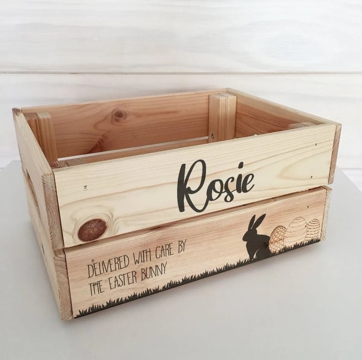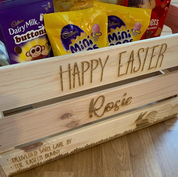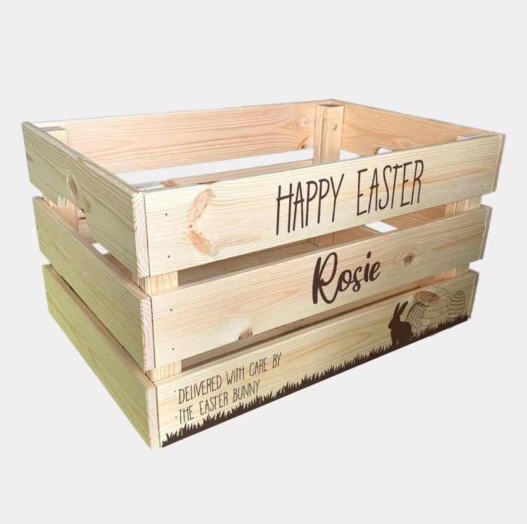 Surprise someone with a wonderfully crafted Easter Crate made from natural pine wood, deep engraved from edge to edge and personalised to your request with name and message.