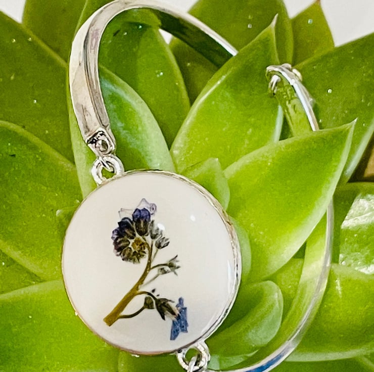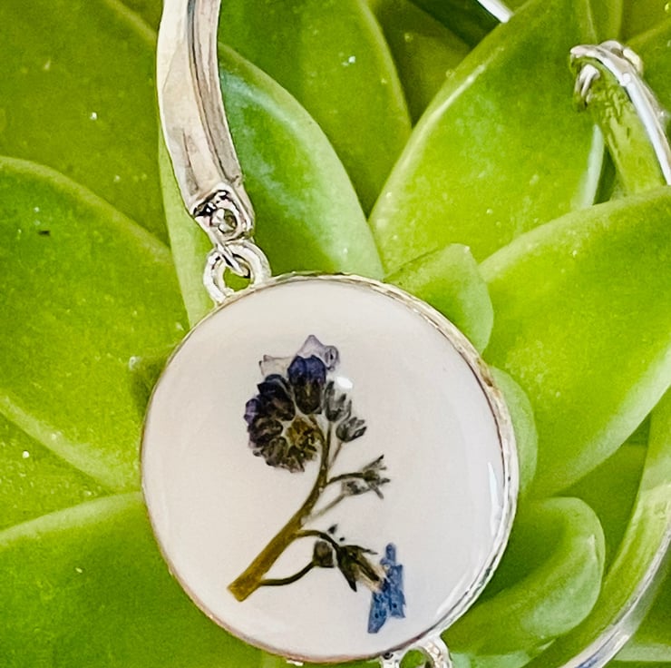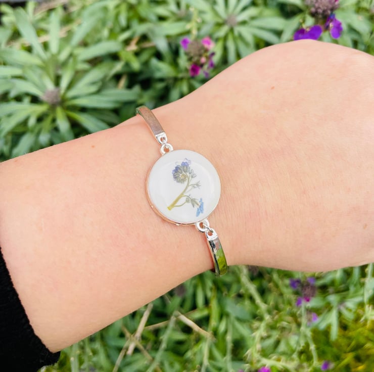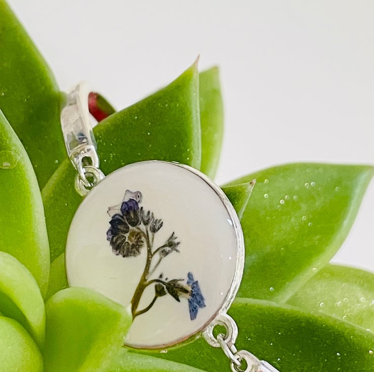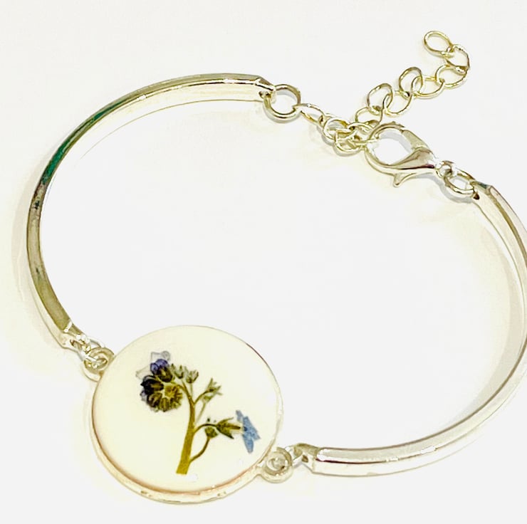 A beautiful, minimalist bracelet with a 2cm charm. A delicate forget me not bud has been embedded between a layer of white opaque resin and a layer of clear resin.