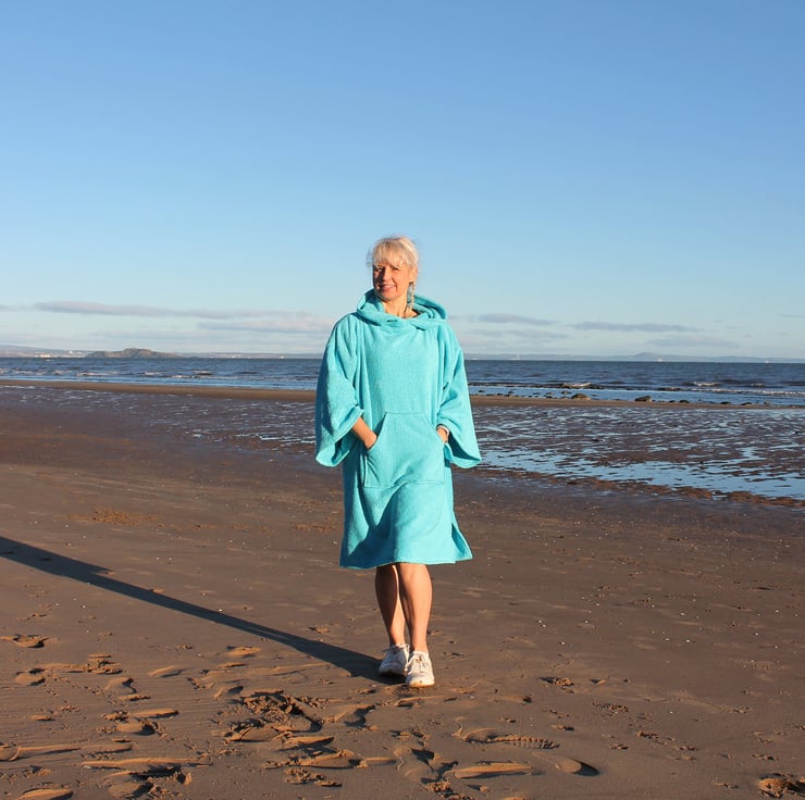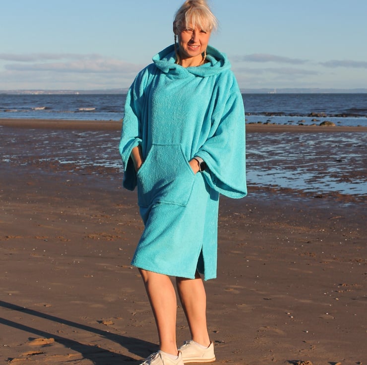 Here is the new product. The hood and the kangaroo pocket are so popular in the original style, we then added baggy sleeves. You can take your arms out of the sleeves, for when you would like to change out of your wet swim kit in privacy. You can keep warm and cosy on the beach while drying off.