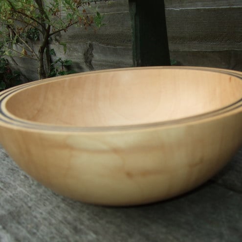 This is a maple bowl turned from locally grown timber here in Mid Cheshire, it has two grooves on the edge which have been stained black, finished with danish oil it will make a nice fruit bowl, the width is 266mm, height 114mm.