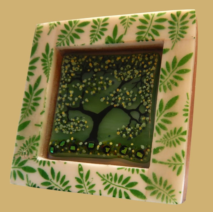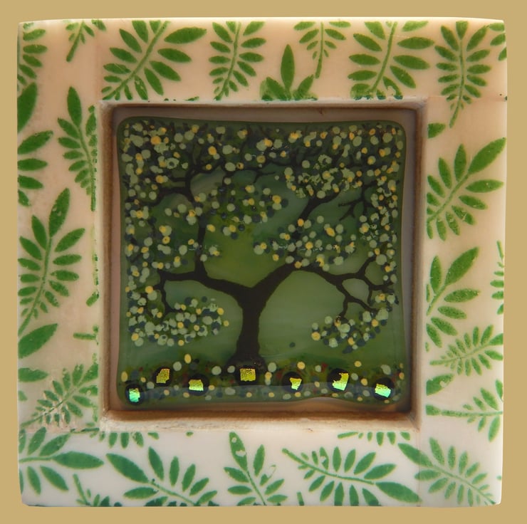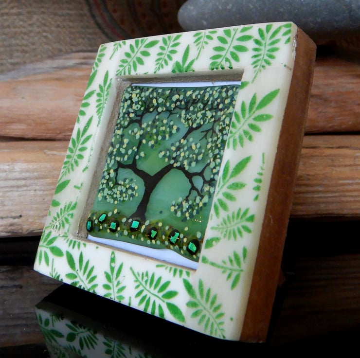 This little picture was made using a variety of different glass types and techniques: wispy glass sheet, frit, dichroic glass and glassline enamelling.