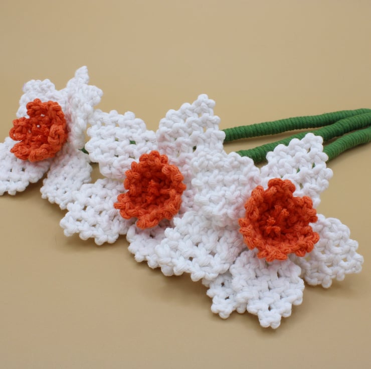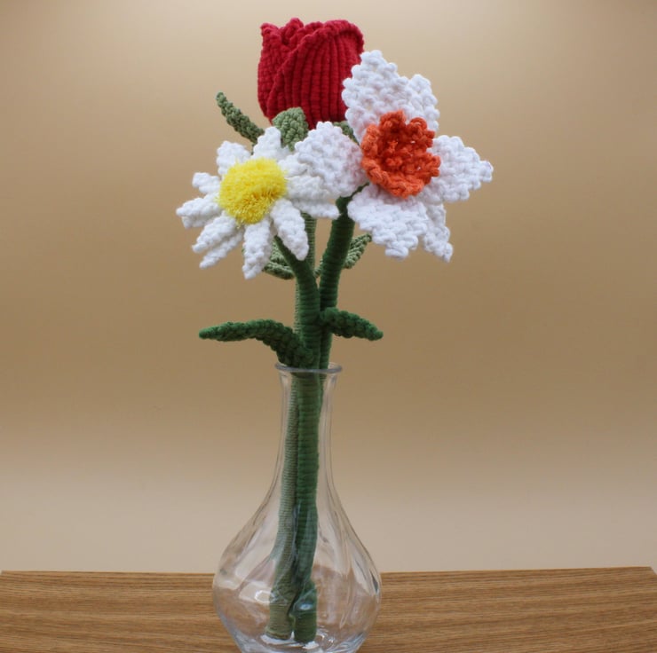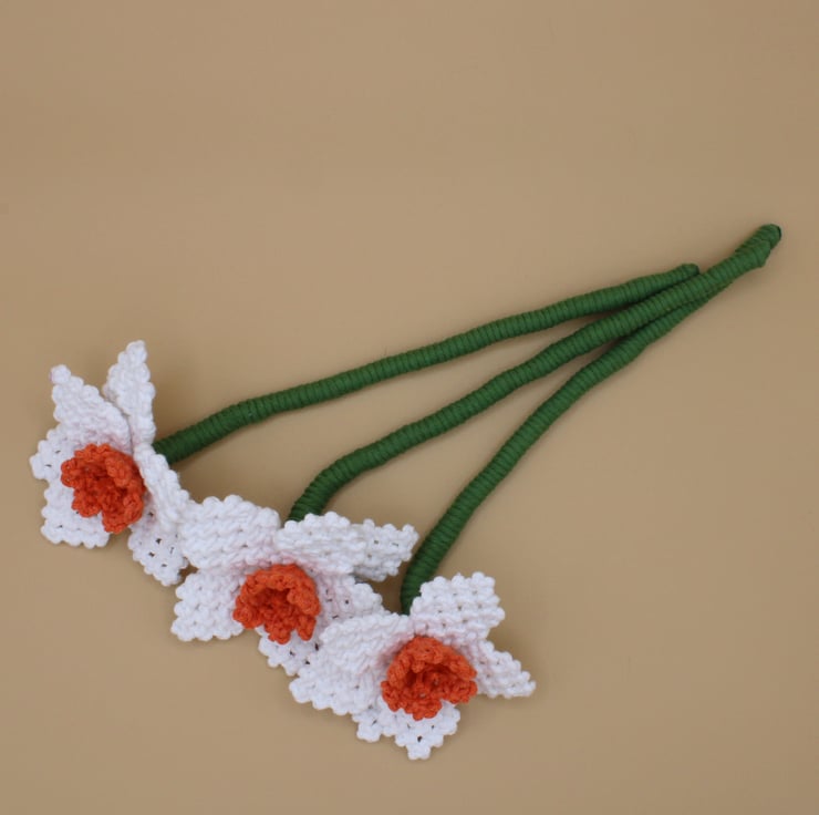 Each flower has been crafted from macramé knots with every knot tied by hand and piece of wire runs through the stem so that they are poseable.