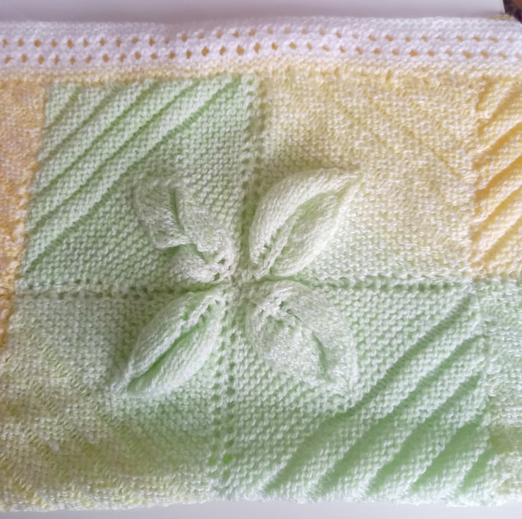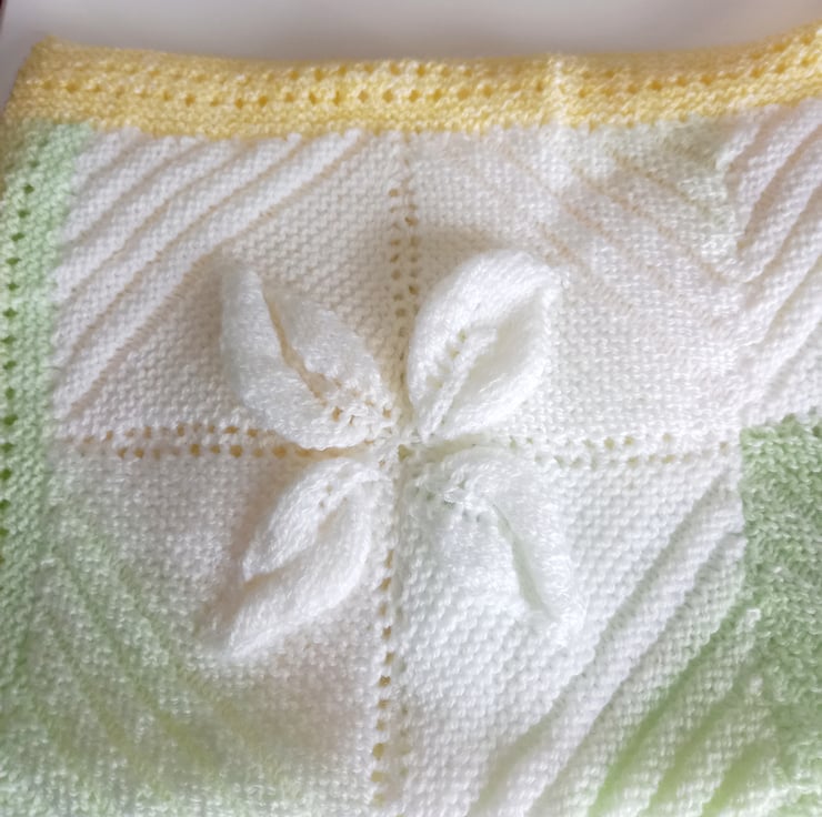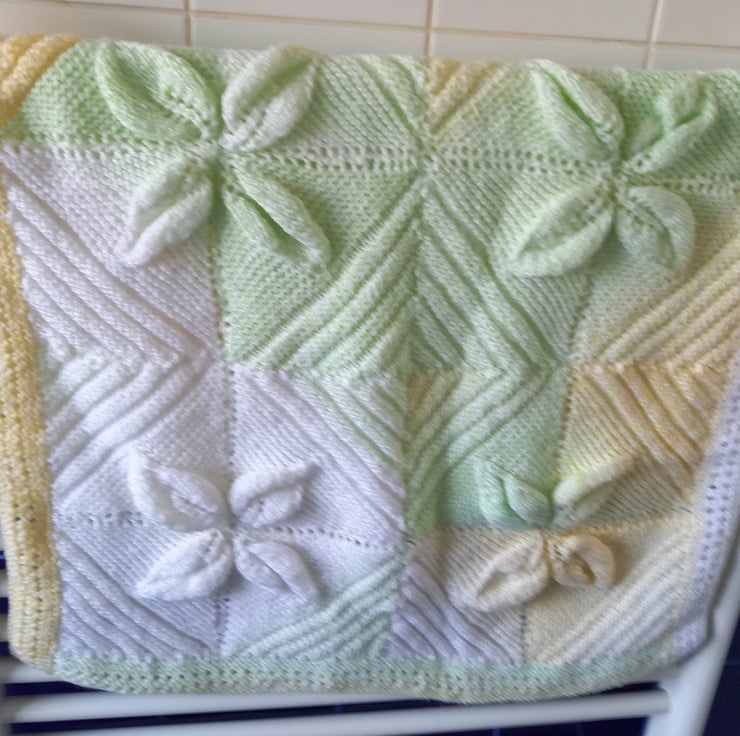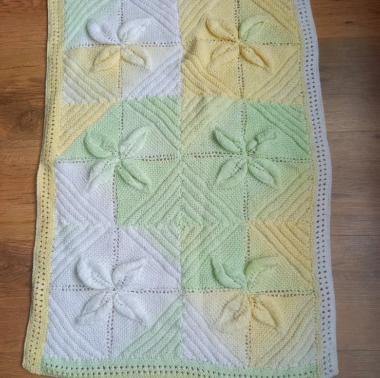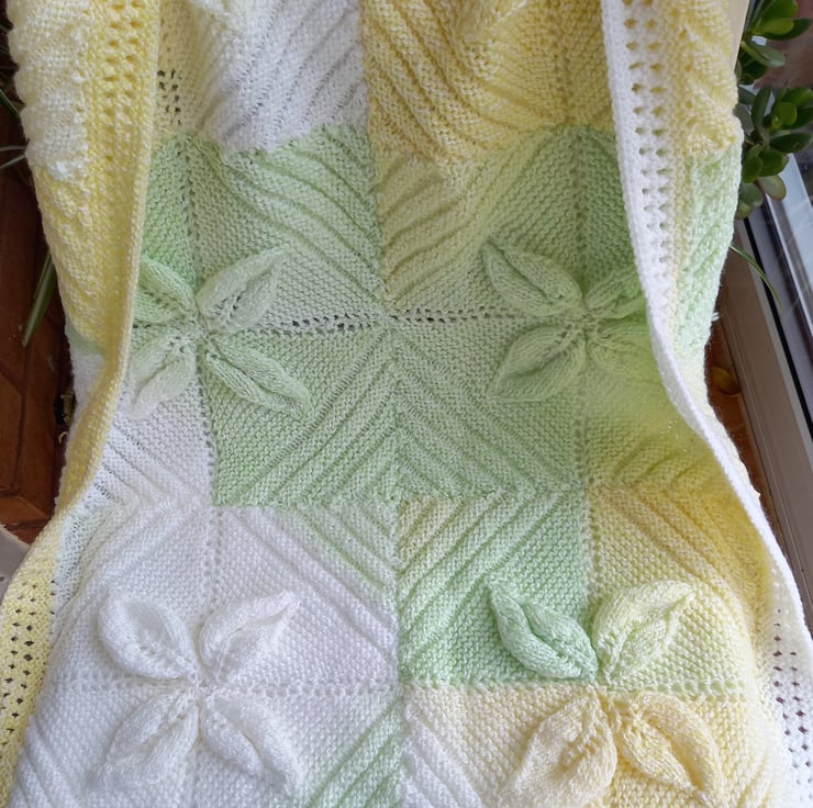 This gender neutral blanket is lovely and soft and lightweight, it is knitted in a self changing colour yarn of white, pale green and lemon.