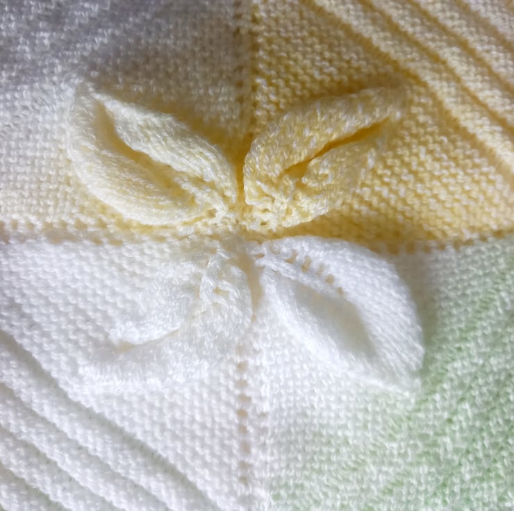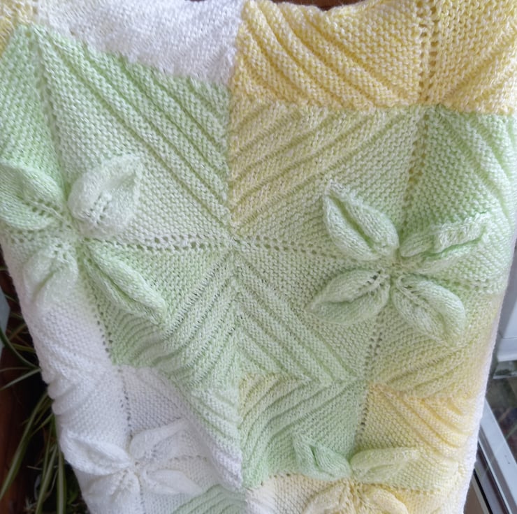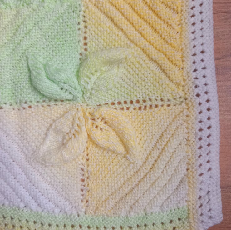 The blanket is made up of 6 squares of garter stitch with stocking stitch leaves in the center, with an eyelet border.