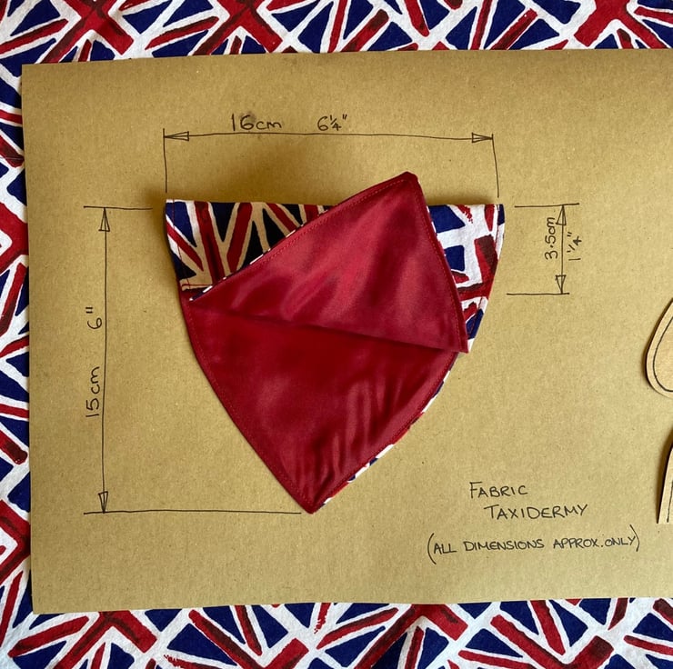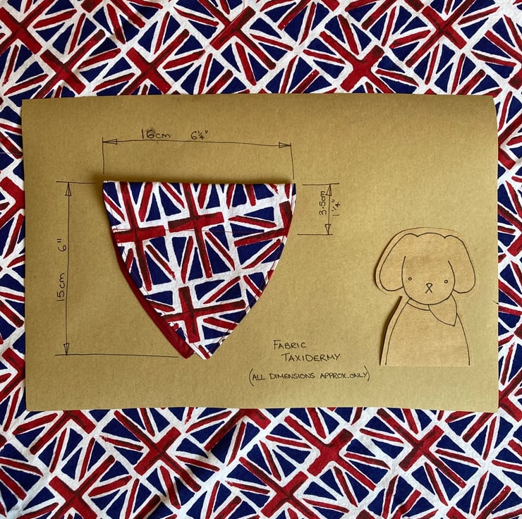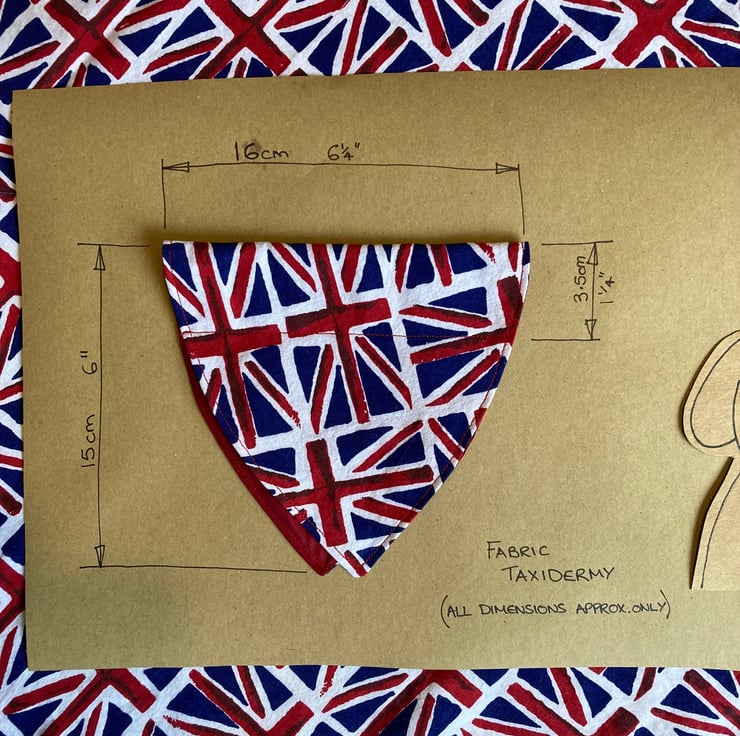 Get your pooch ready to celebrate the Jubilee with this handmade bandanna. Simply slips onto your dogs collar and can be easily washed at 30deg, line dry. Overall sizes shown on photo and width of sleeve, which the collar slides through.