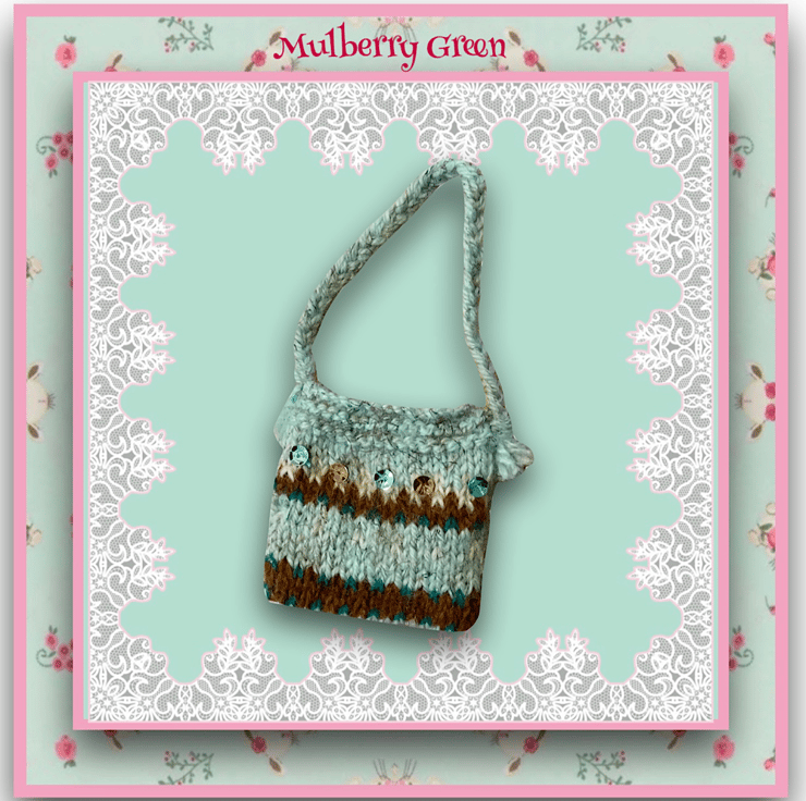 A sweet little knitted bag in duck egg blue flecked wool with a Fair Isle pattern on the front. The bag is lined with a vintage hot air balloon fabric and is decorated with sequins. It matches the other items in the Beautiful Balloons collection and is just the perfect size for the Mulberry Green characters.