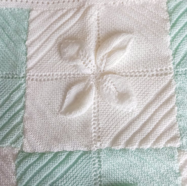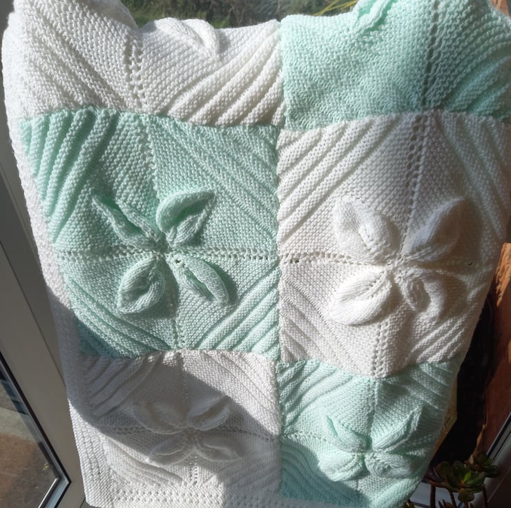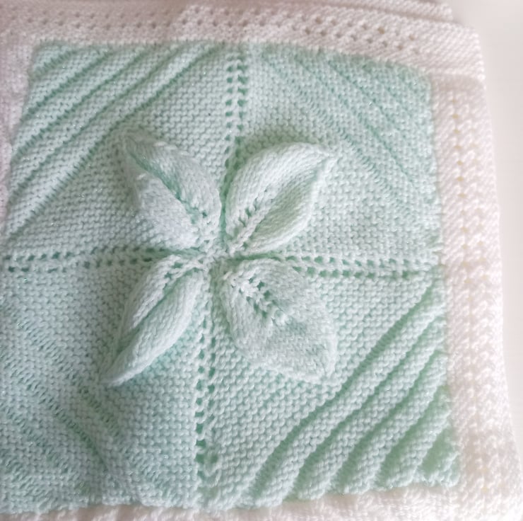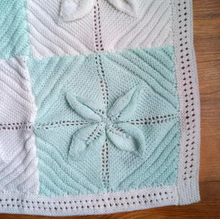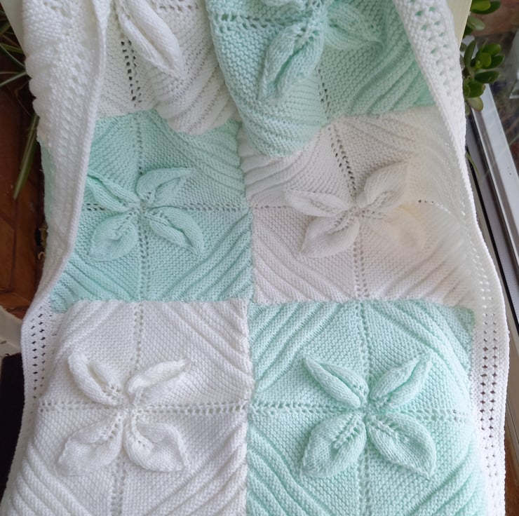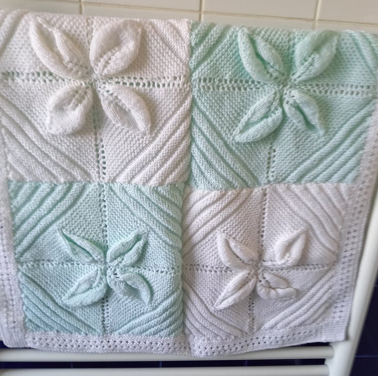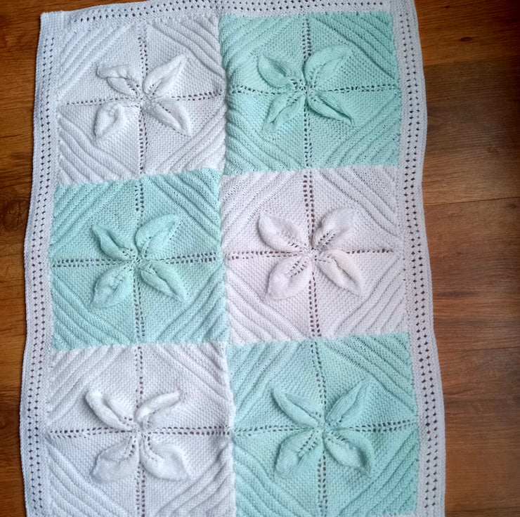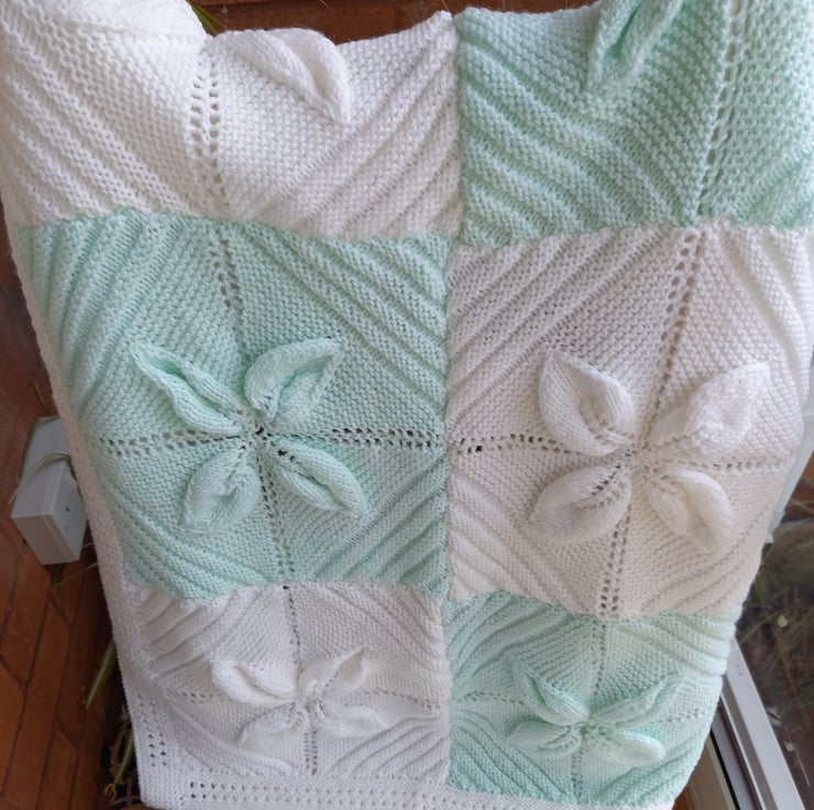 The blanket is made up of 6 knitted square's, joined together, 3 white, 3 turquoise. Each square is knitted in garter stitch with stocking stitch leaves in the centre, the turquoise square's have a shiny thread running through the yarn.