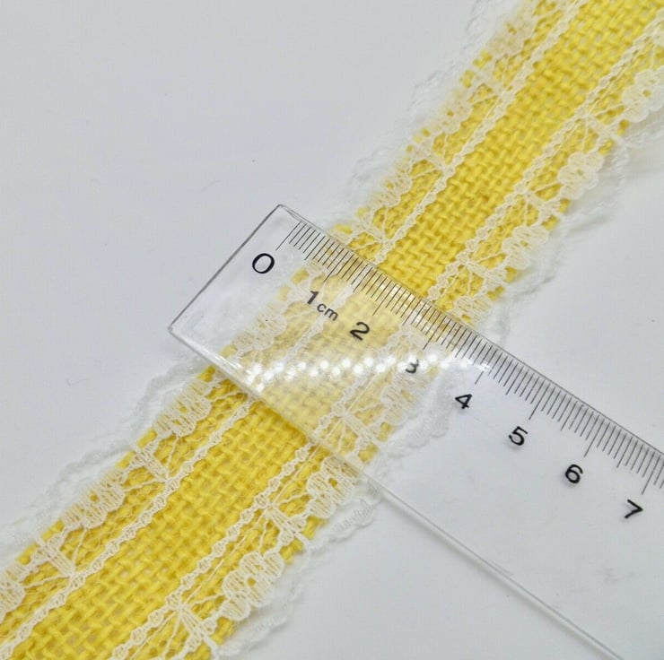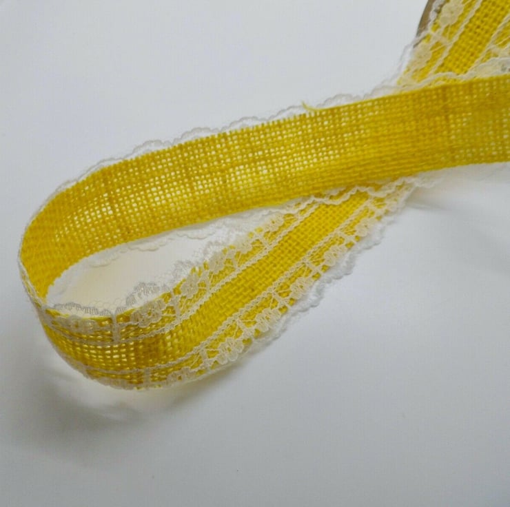 Pretty craft ribbon in yellow jute, trimmed with dainty white nylon lace