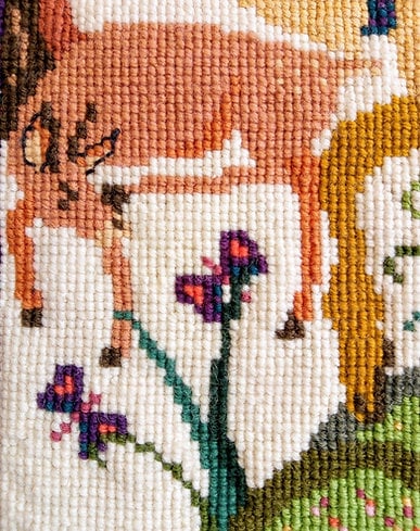 This quirky tapestry cushion or wall-hanging is inspired by a ceramic illustration of the tale of Bahram Gur, the Hunter King.