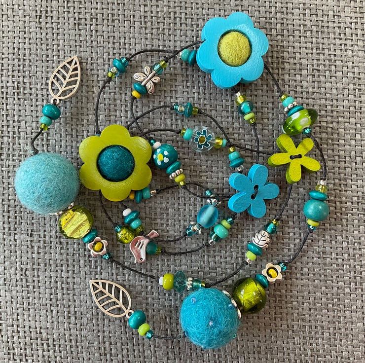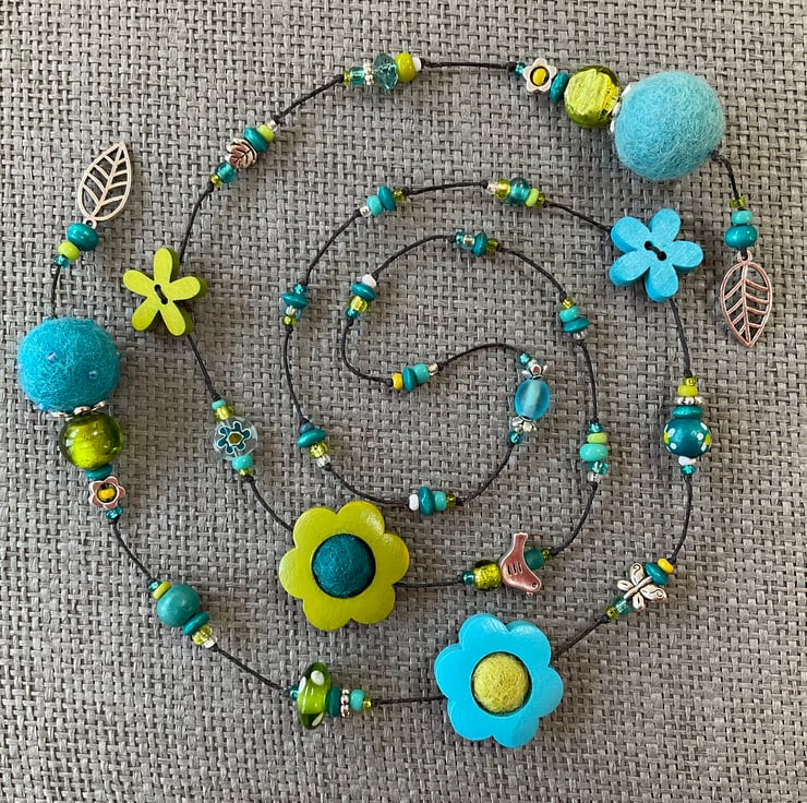 Lariat necklace featuring a glorious mixture of beads in shades of turquoise and fresh green, with a touch of white here and there. The beads include large and small painted wood flowers, felt balls, glass, millefiori and wooden beads, as well as antique silver tone bird, butterfly, leaf and flower beads.
