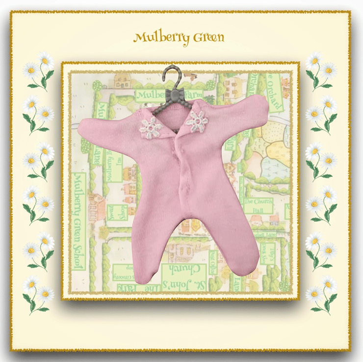 A cute little pink sleep suit for baby Daisy. The sleep suit is made from pink cotton jersey and is trimmed with tiny daisies. Perfect for baby Daisy’s bedtime.