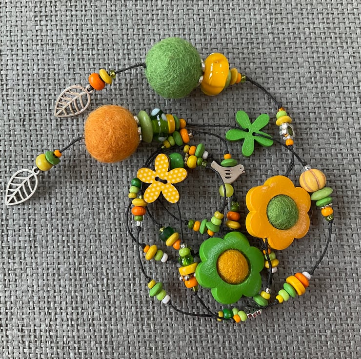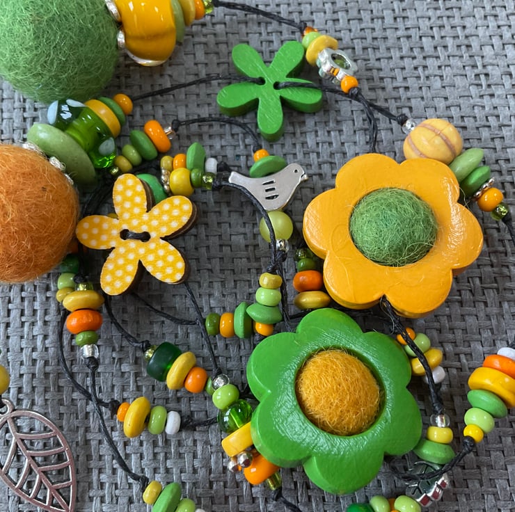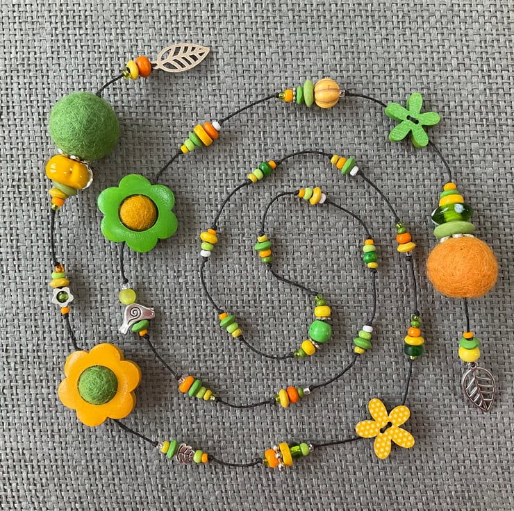 Lariat necklace featuring a glorious mixture of beads in shades of yellow and fresh green, with a touch of orange or white here and there. The beads include large and small painted wood flowers, a polka dot flower, felt balls, glass, recycled glass, Polaris and wooden beads, as well as antique silver tone bird, leaf and flower beads.