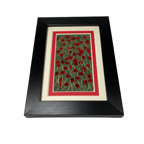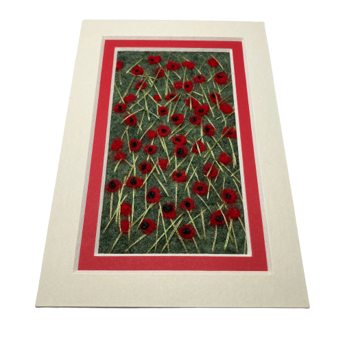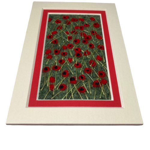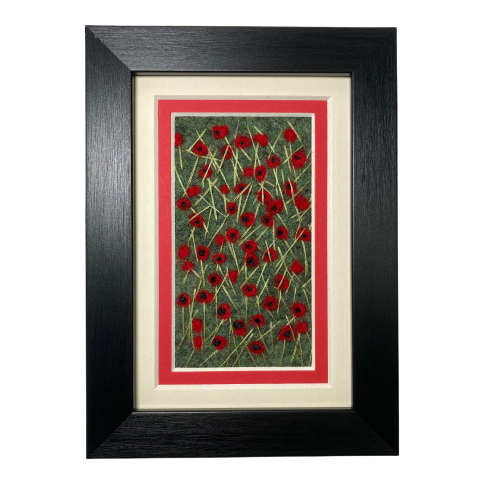 This is a delightful picture fo a field of poppies. The poppies have been needle felted onto a background of hand made green felt. The stems and black centres have been added using hand embroidery.