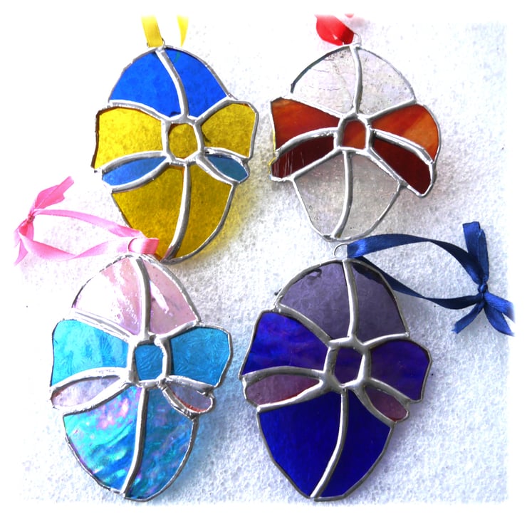 It hangs from a matching coloured ribbon securely attached to the top of the egg by a soldered wire ring.