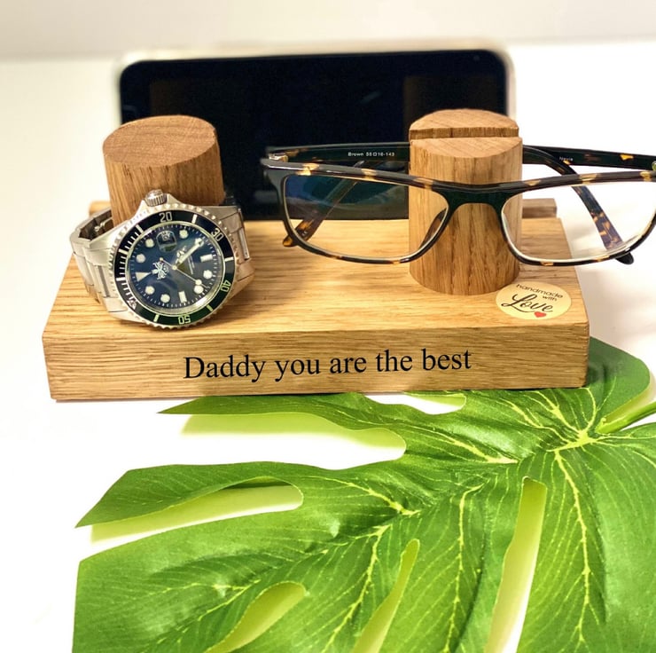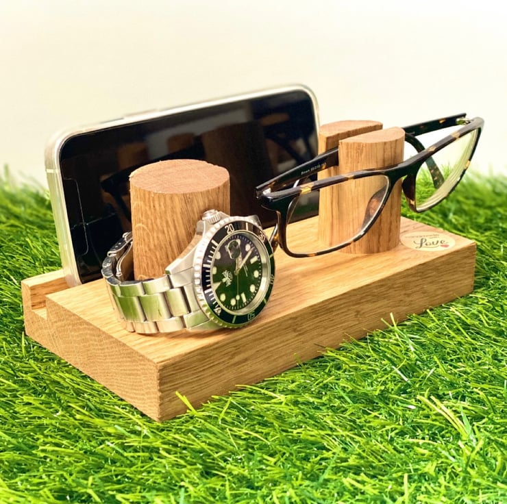 This stylish personalised bedside accessories stand is a great bedside companion to display and charge your mobile phone and keep your glasses and watch safe overnight.