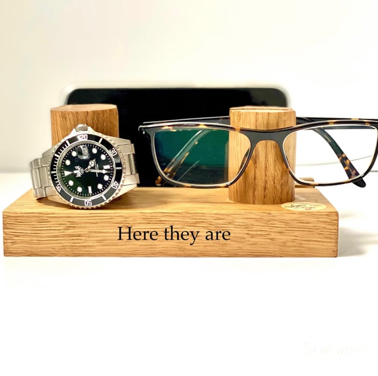 This trendy accessories stand is handcrafted from quality solid oak and polished in enhancing oil to provide a protected smooth finish. The stand is designed with space to display your watch and glasses and a mobile phone mount running the along back.