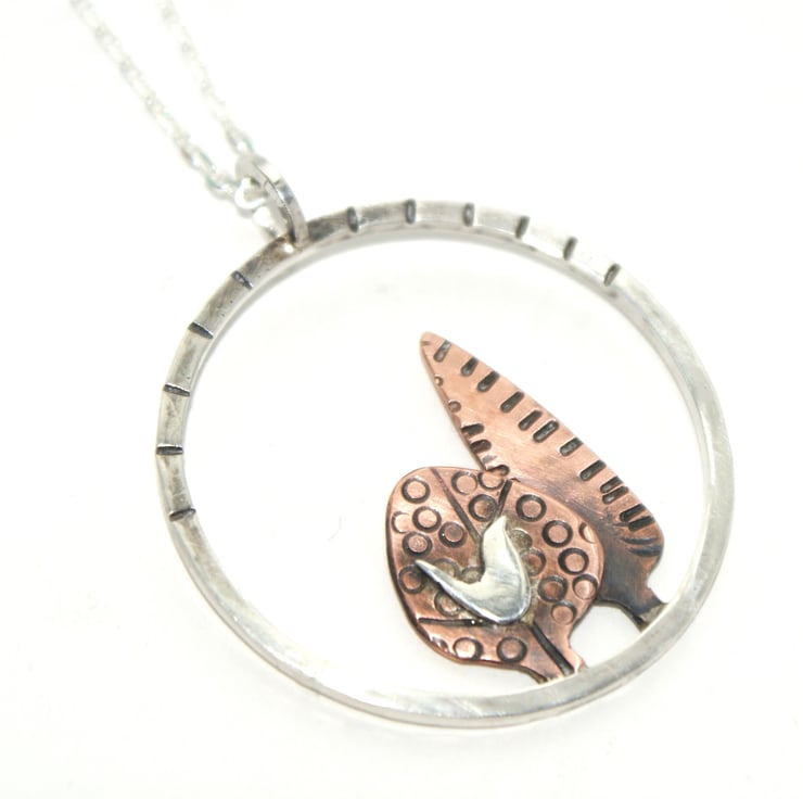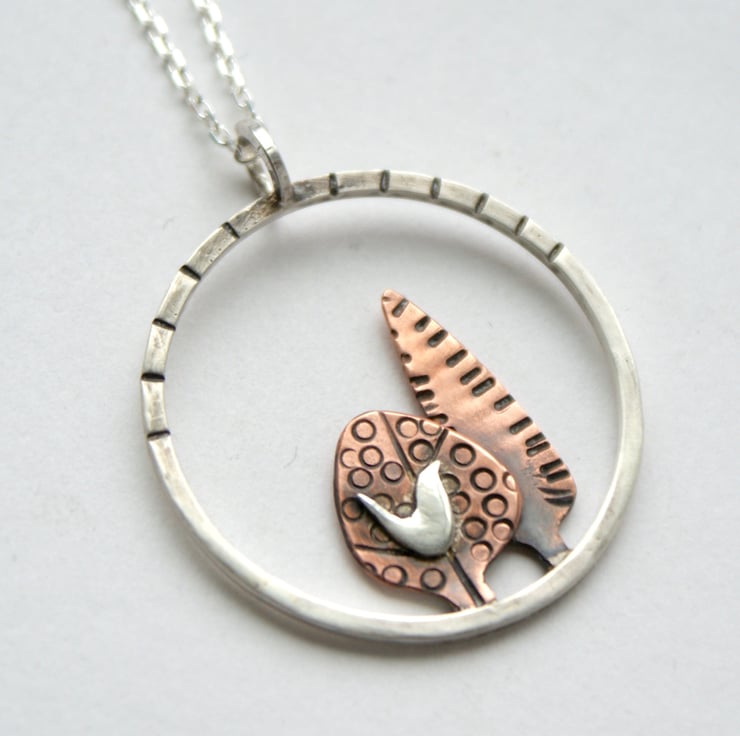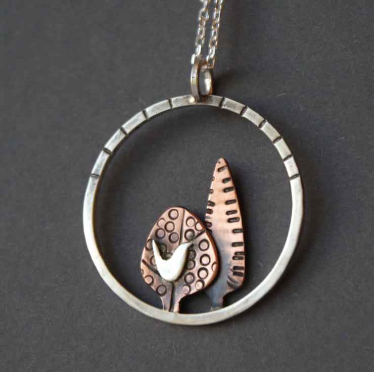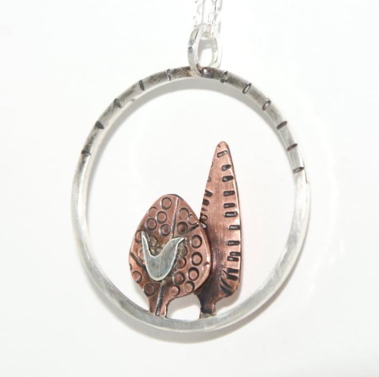 A lovely silver and copper necklace featuring 2 hand cut copper trees with a little silver bird set within a sterling silver circle. The metal has been textured, oxidised and rubbed back for depth. The pendant is hung from an 18 inch sterling silver chain.