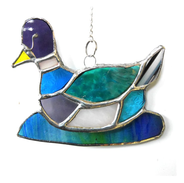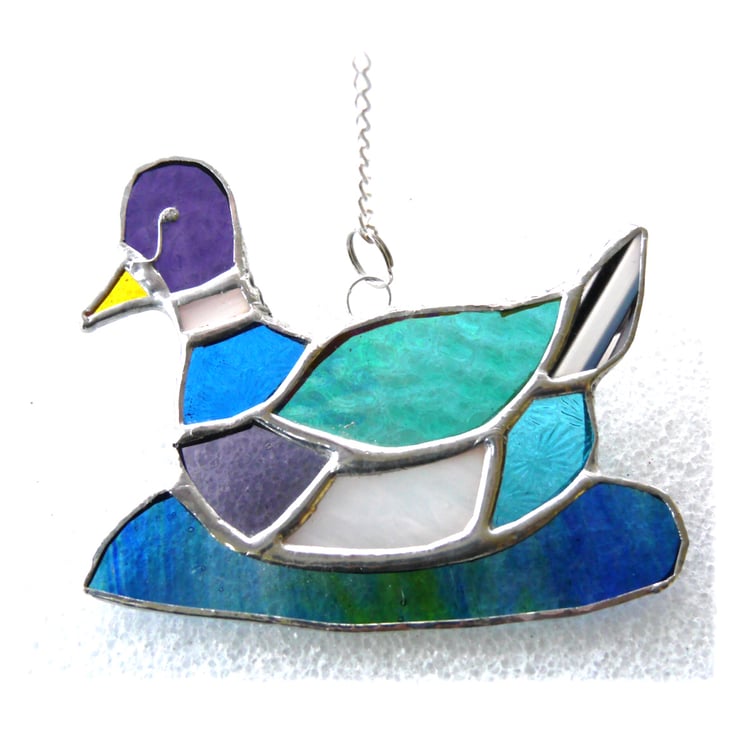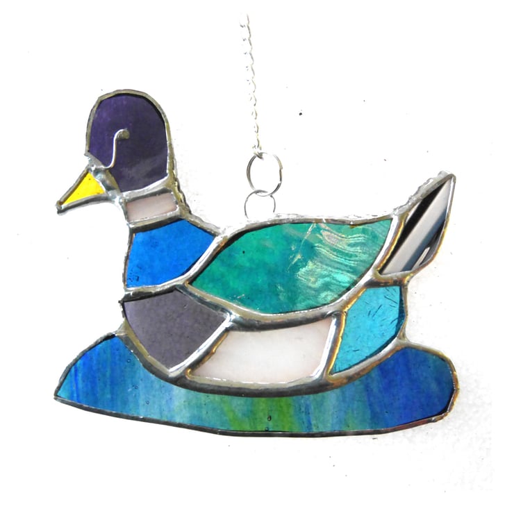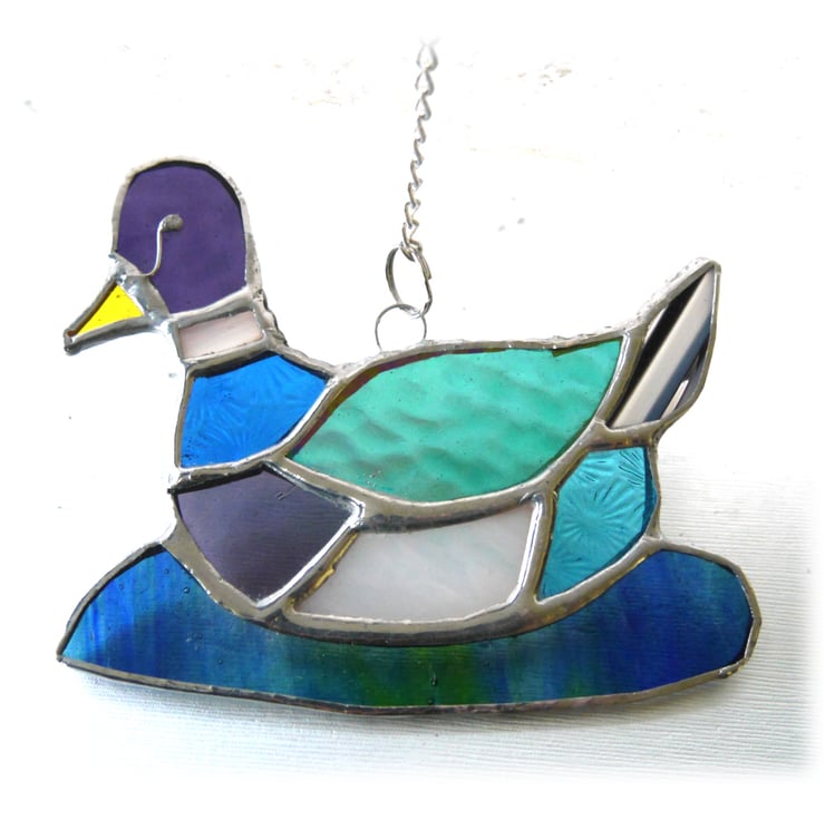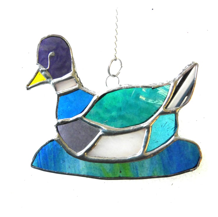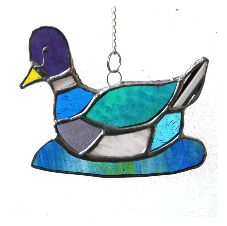 The duck is sitting on a pool of streaky blue-green coloured water and looks absolutely gorgeous hanging in the window and the light which makes it lovely colours shimmer.
