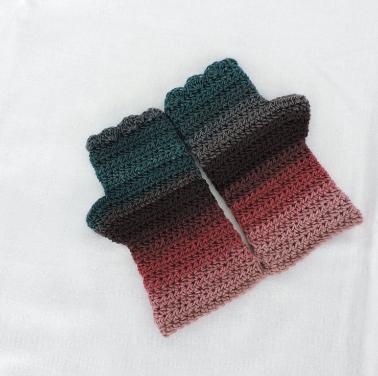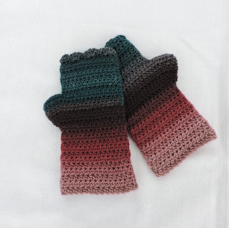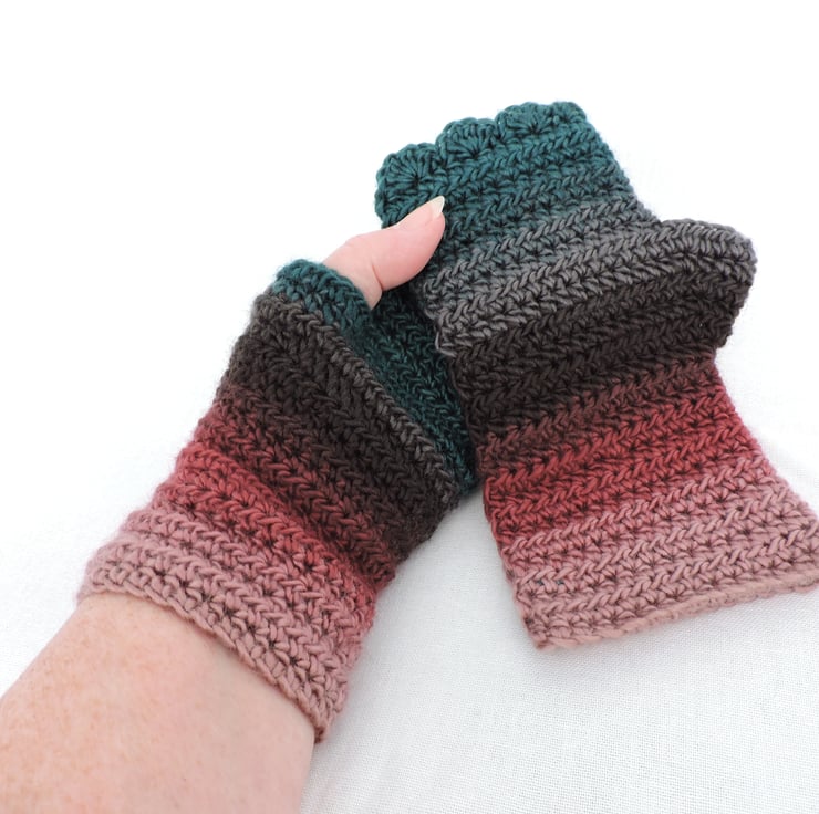 Sale These adults crocheted fingerless mitts have been made using a self striping 100% acrylic double knit yarn. Graduated colours of pink, rose pink, charcoal grey and teal. They have a plain body with a wavy edged top.. A stylish winter warmer, ideal for dog walkers or those who like to have their fingers free.