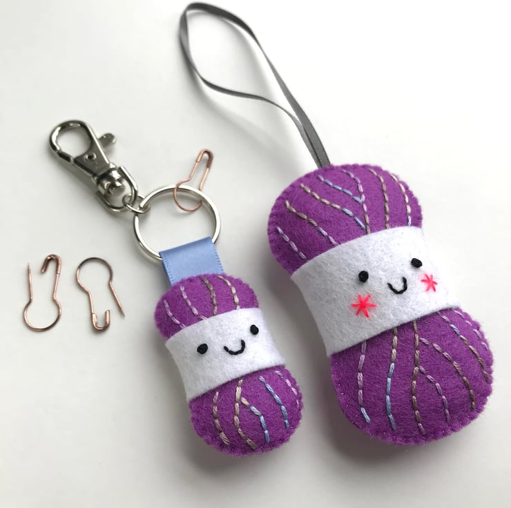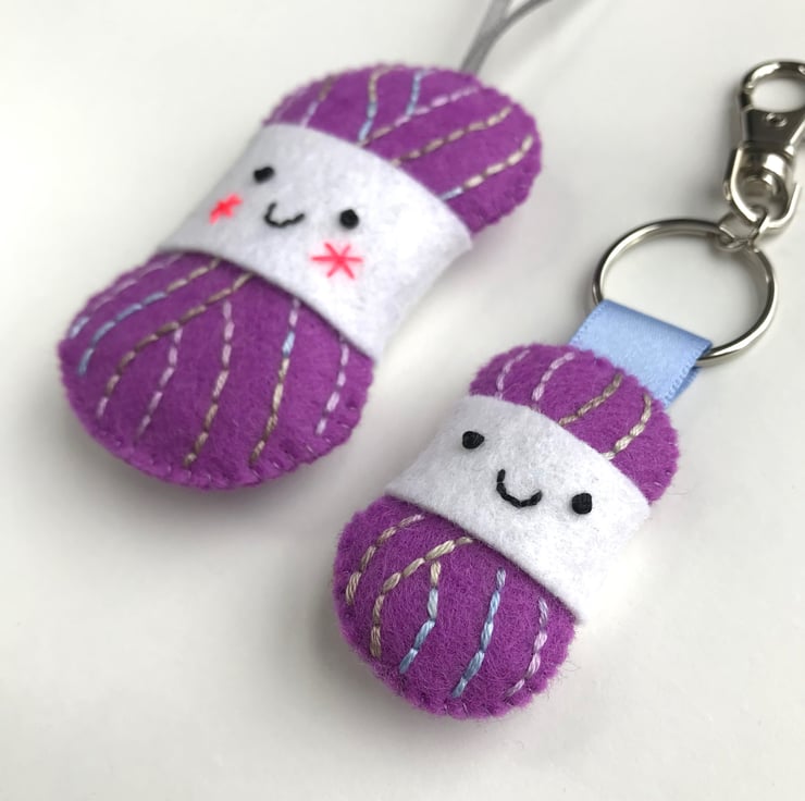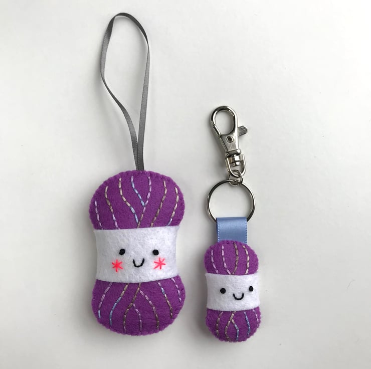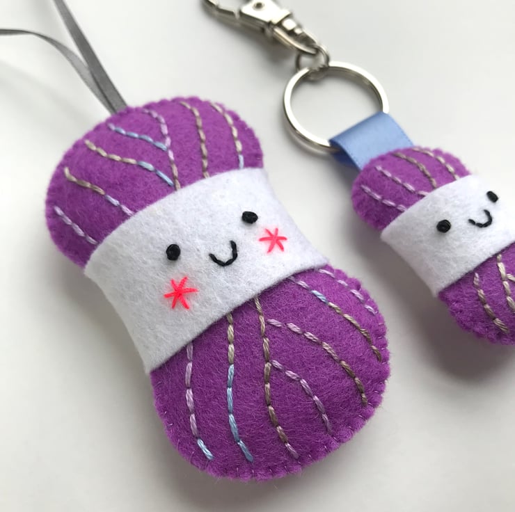 Each yarn ball is hand stitched with multicoloured embroidery threads, onto 100% wool felt. The large yarn ball is stuffed with lavender and a little toy stuffing. On the keyring, the ribbon loop is also held in place with glue and hand stitching.