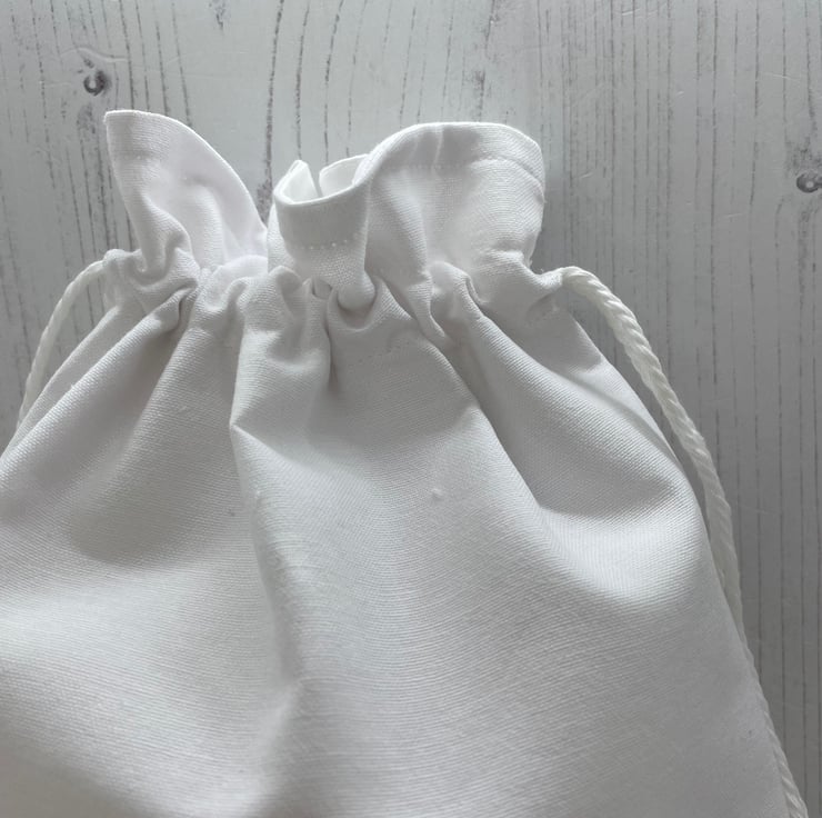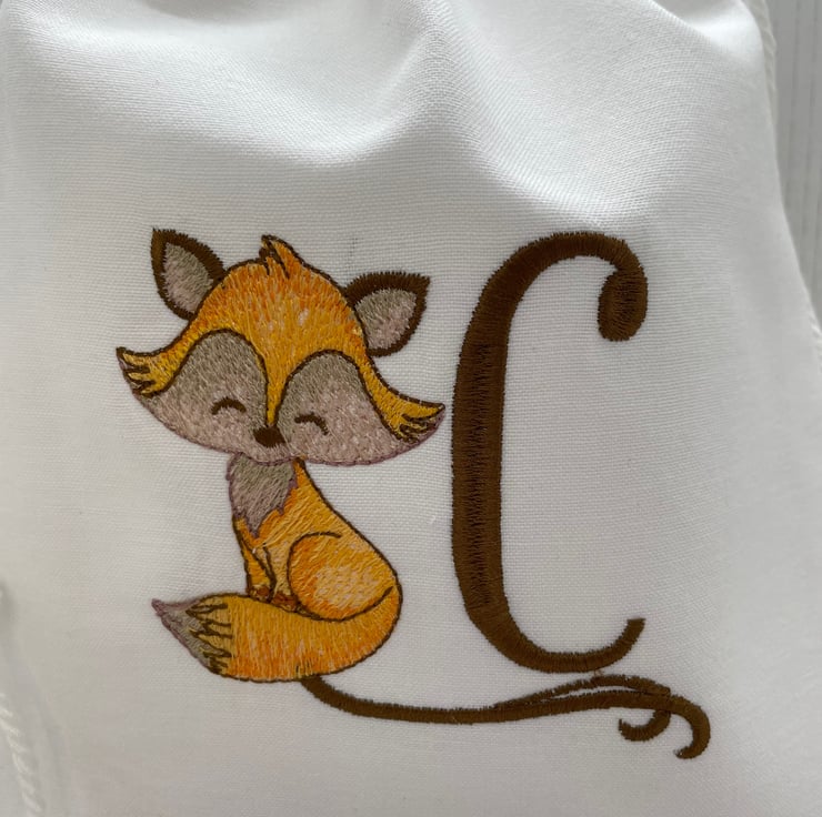 White cotton outer and lining. Embroidered with a cute fox and the initial ‘C’Cotton cord as the drawstring.