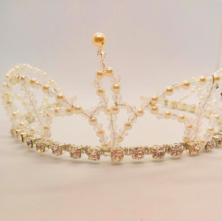 The tiara is on a silver plated flexible base and has curved decorations, made from small 4 mm pearl beads and 4 mm clear bicone crystal beads. The tiara base is silver plated and is covered by a silver plated crystal chain.