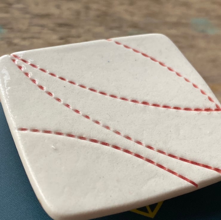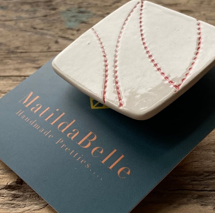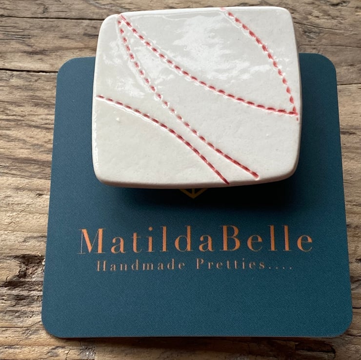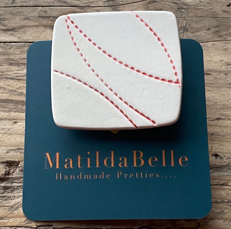 Handmade Ceramic Brooch. Such a simple yet eye catching design imprinted with a delicate Red glazed pattern. Clear Glazed on the front and kept natural on the back where the quality of clay can be admired. You will also find the MB makers mark on the reverse. The Brooch is fitted with a good quality safety catch pin.