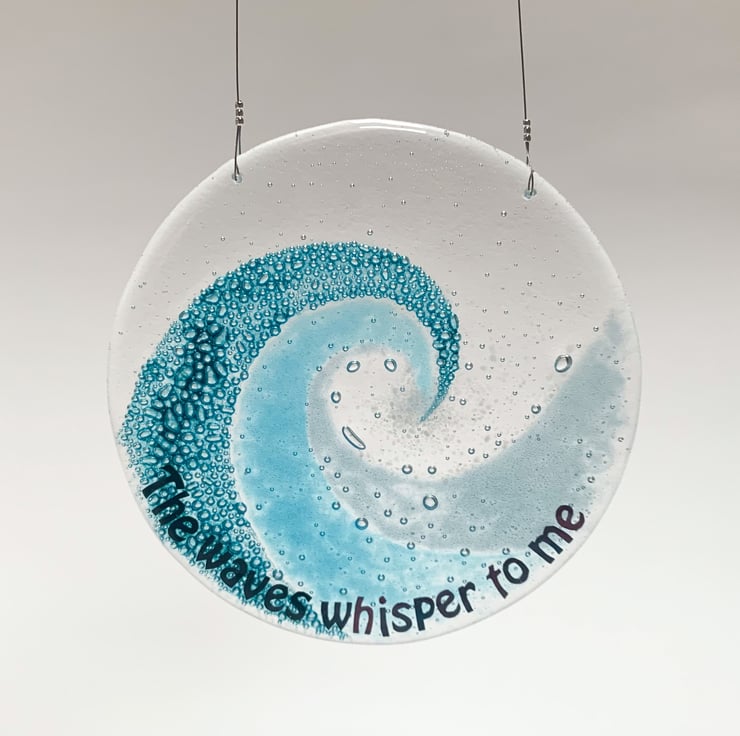 Fused glass hanging suncatcher, inspired by my awe of the pure energy and colours of the sea. This suncatcher features hand cut copper words saying "The waves whisper to me." It looks beautiful when hung in a window. A beautiful gift for a friend or relative who loves the ocean and perhaps dreams of having a seaview from their window.