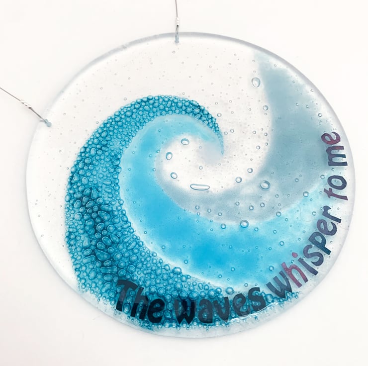 To make it, I cut transparent art glass into 2 circular shapes and used specialist paints and powdered glass to create my wave design. I then added to copper letters. I fused it overnight slowly in my kiln. In the heat of the kiln, the specialist paint changed into hundreds of tiny turquoise bubbles. When completely cooled, I drilled the tiny holes and added a hanging wire.
